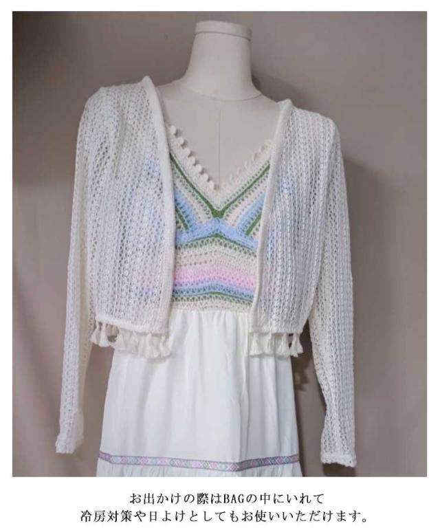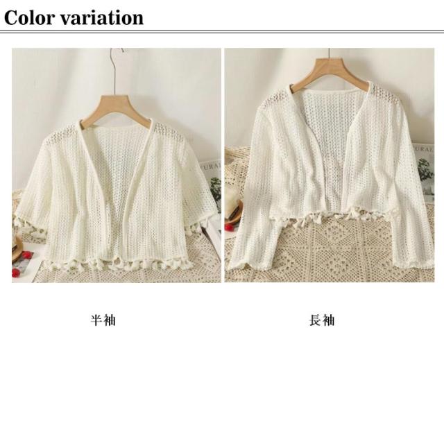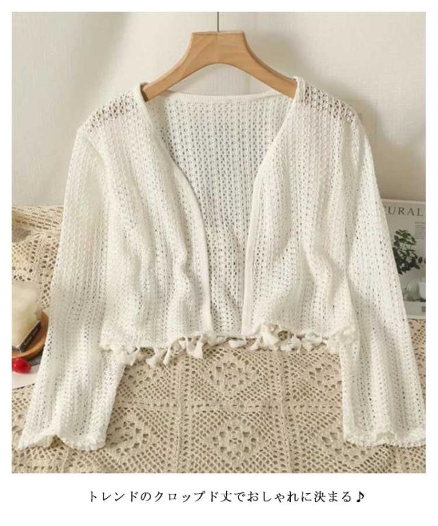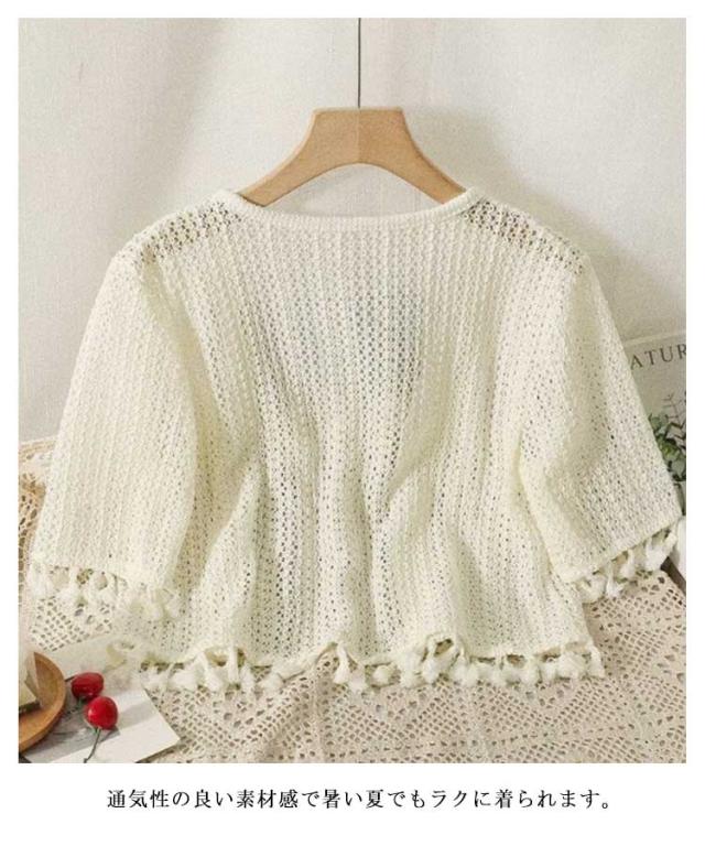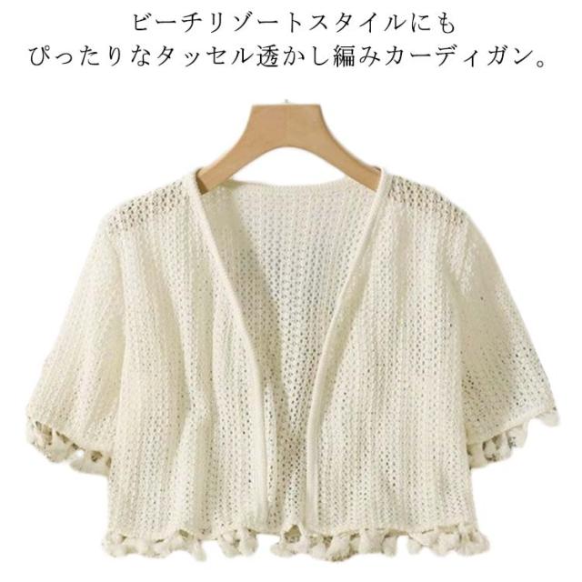 半袖 カーディガン 透かし編み レディース サマーカーディガン タッセル 薄手 夏用 カーデ 長袖 シアー トップス ボレロ 羽織り ショート丈 ボタンなし 透かし 透け感 UVカット 冷房対策 春夏 透かし編みカーデ おしゃれ 大人可愛い 海辺 ビーチ リゾート 【送料無料】