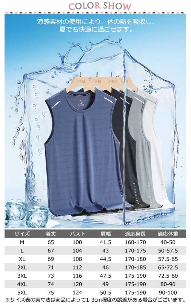 | 4枚セットメンズ接触冷感タンクトップ 涼感素材の使用により、体の熱を吸収し、夏でも快適に過ごせます。 吸水速乾素材を使用、優れた吸汗性と速乾性を発揮します。 ドライ素材は表面がメッシュ状になっているので通気性に優れた。 生地が柔らかく伸びるので、体を締めつけず快適に過ごせます。 | |