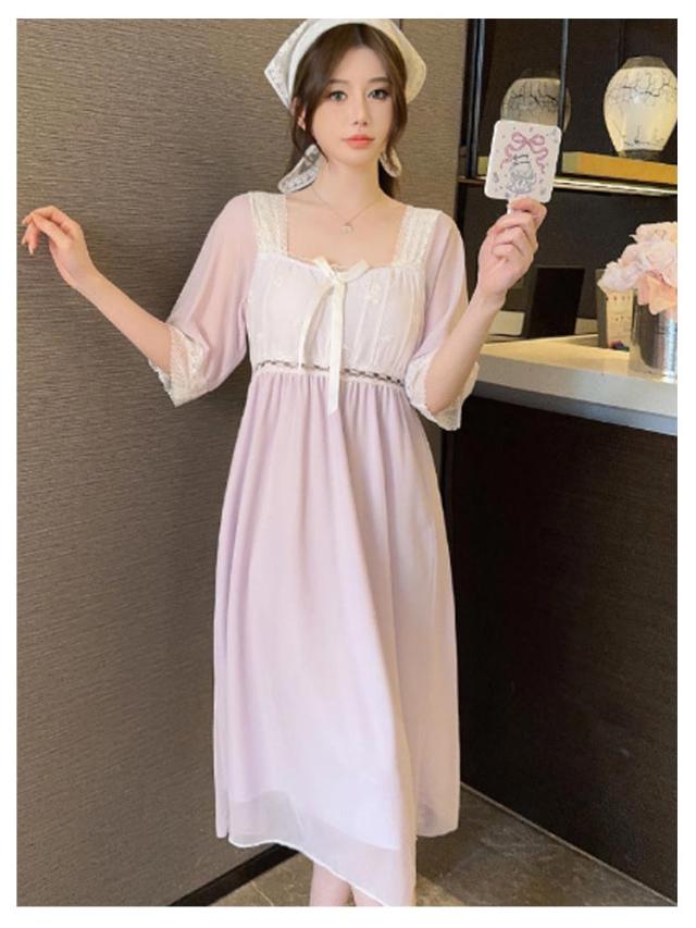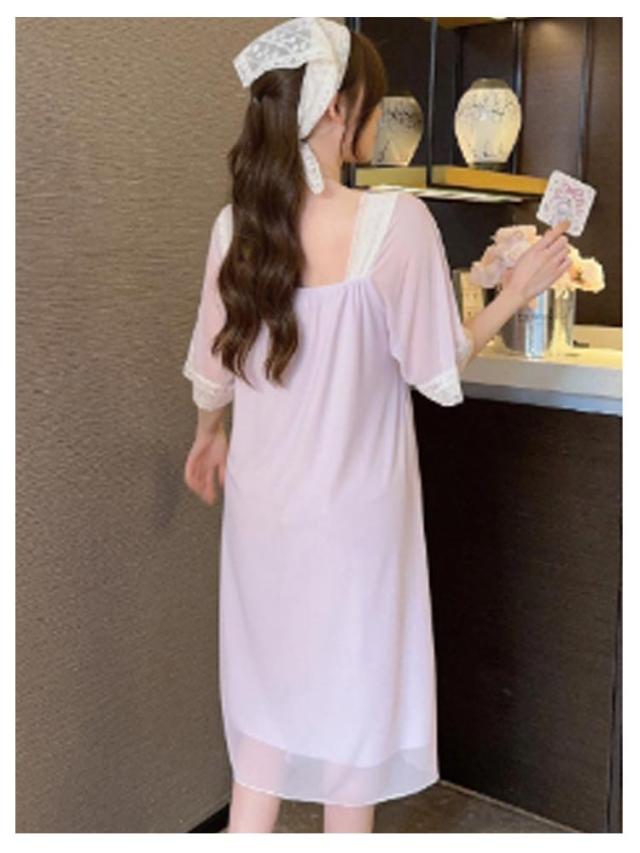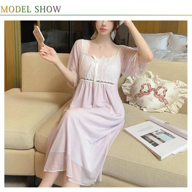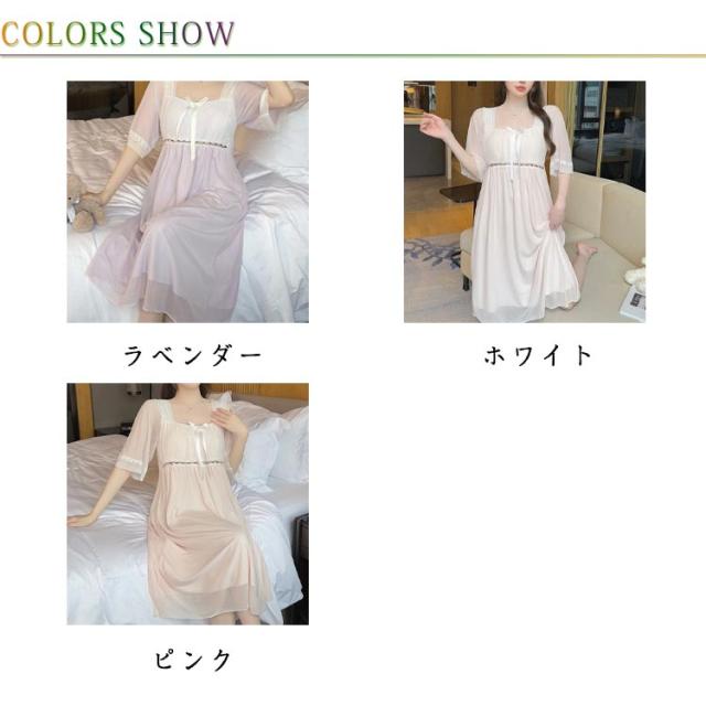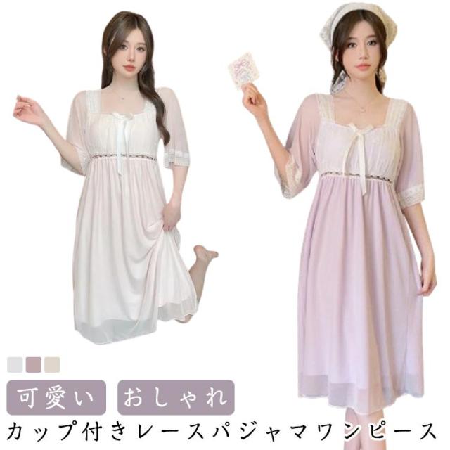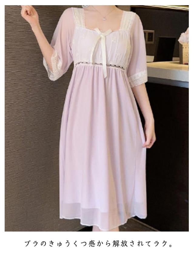 部屋着 ルームウェア ナイトドレス パジャマ パッド入り カップ付き 部屋着 レース 袖あり レディース 夏 膝丈 かわいい ワンピース
