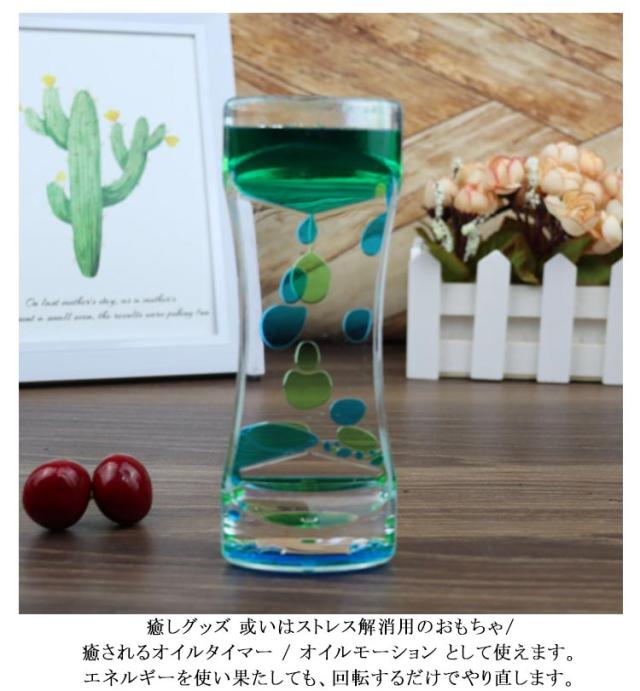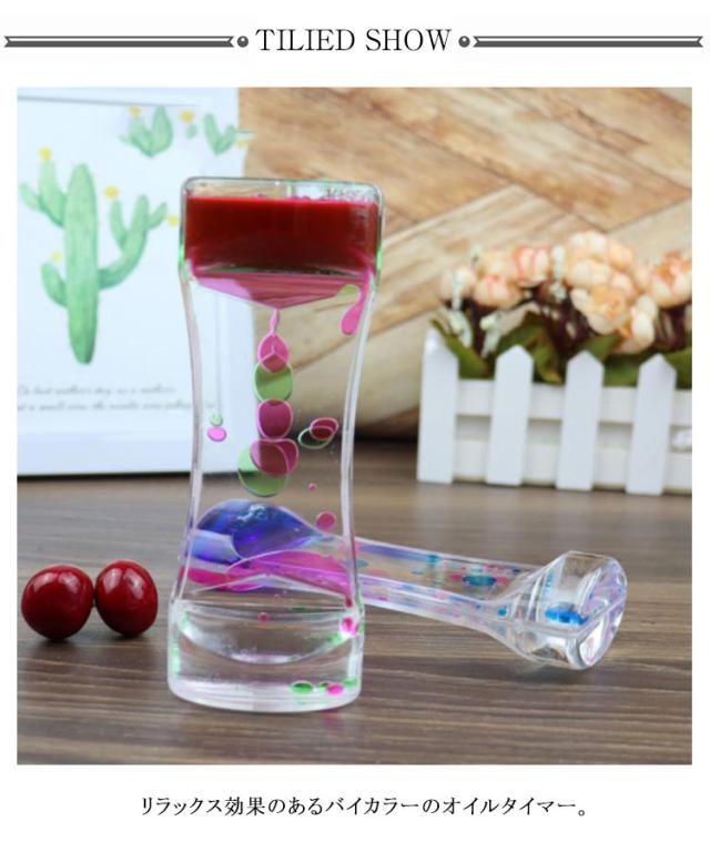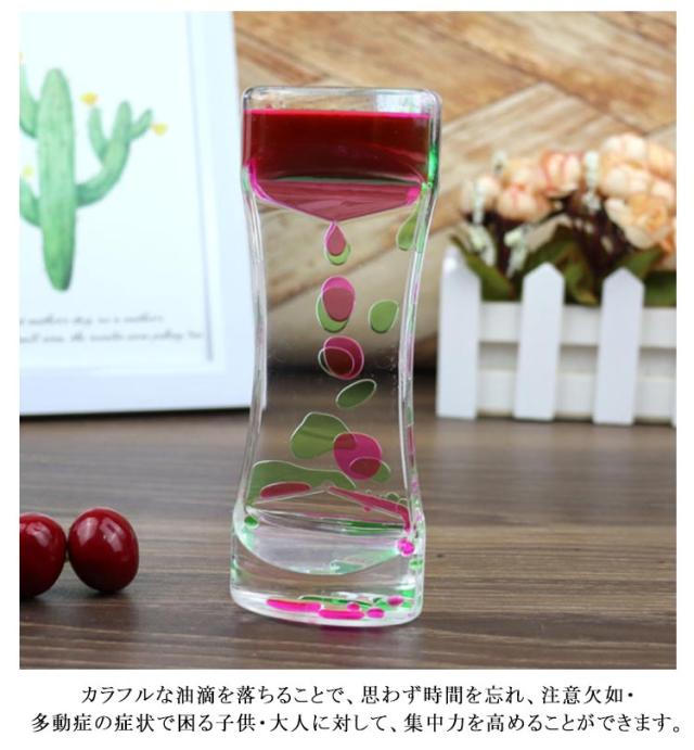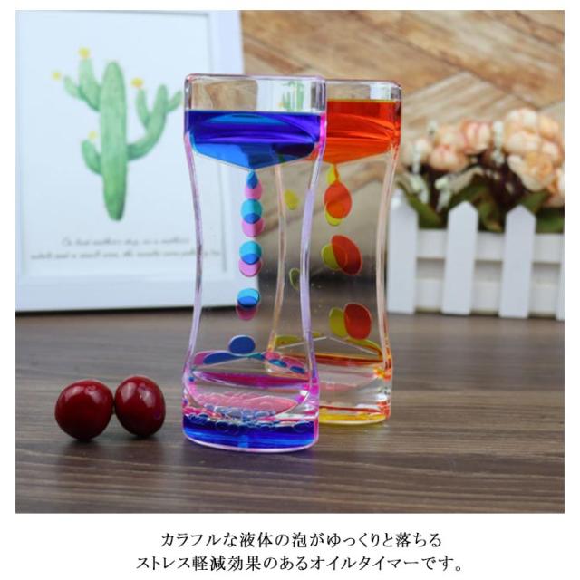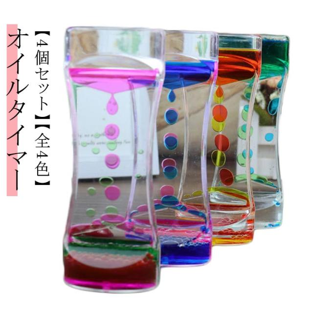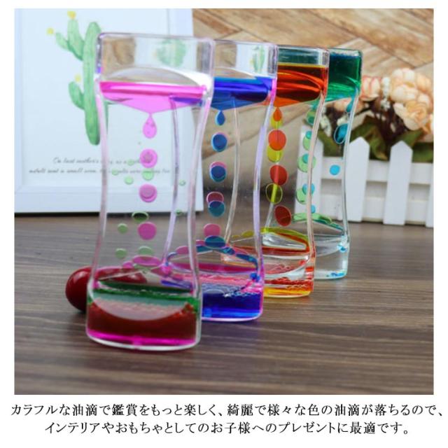 | 【4個セット】【オイルタイマー】【全4色】 リラックス効果のあるバイカラーのオイルタイマー。 カラフルな液体の泡がゆっくりと落ちるストレス軽減効果のあるオイルタイマーです。 カラフルな油滴で鑑賞をもっと楽しく、綺麗で様々な色の油滴が落ちるので、インテリアやおもちゃとしてのお子様へのプレゼントに最適です。 いつまでも飽きずに見ていられます。 癒しグッズ 或いはストレス解消用のおもちゃ/癒されるオイルタイマー / オイルモーション として使えます。エネルギーを使い果たしても、回転するだけでやり直します。 カラフルな油滴を落ちることで、思わず時間を忘れ、注意欠如・多動症の症状で困る子供・大人に対して、集中力を高めることができます。 | |
