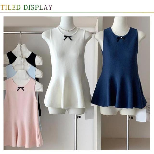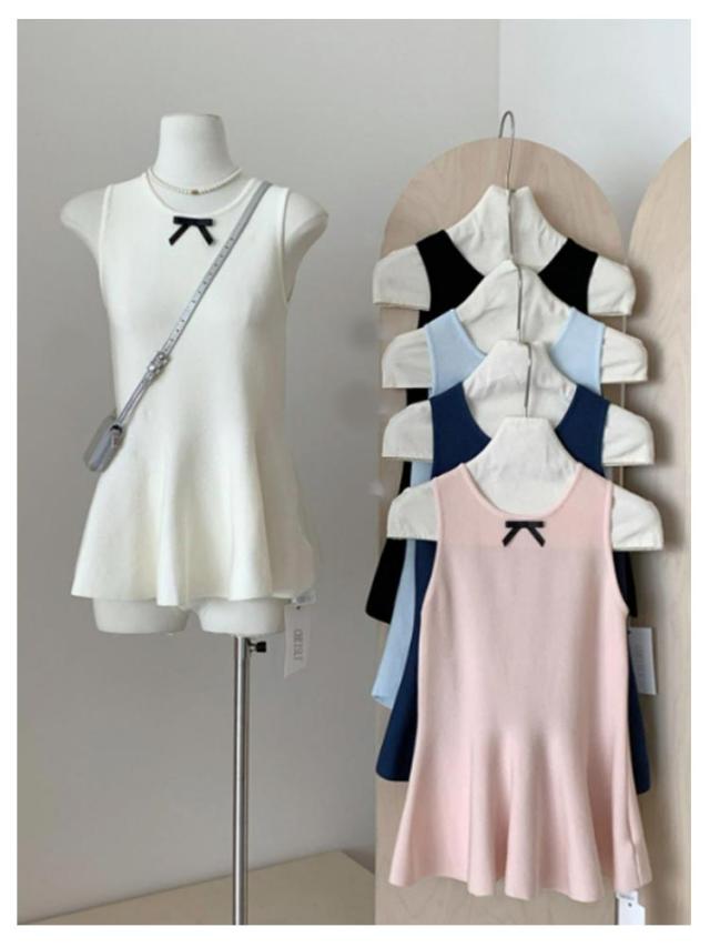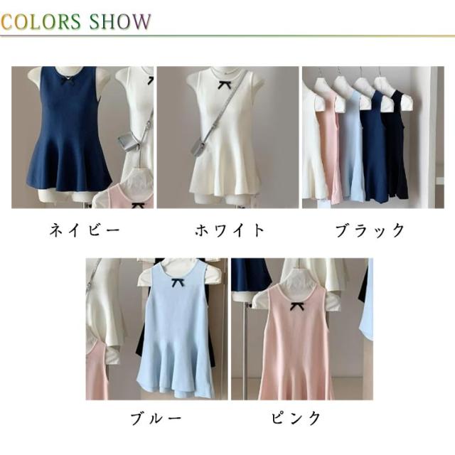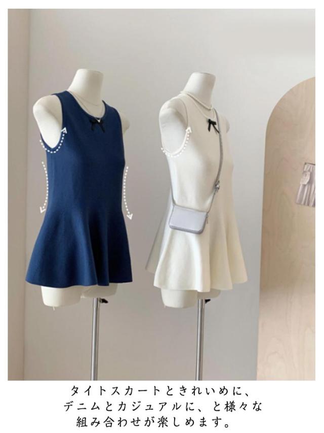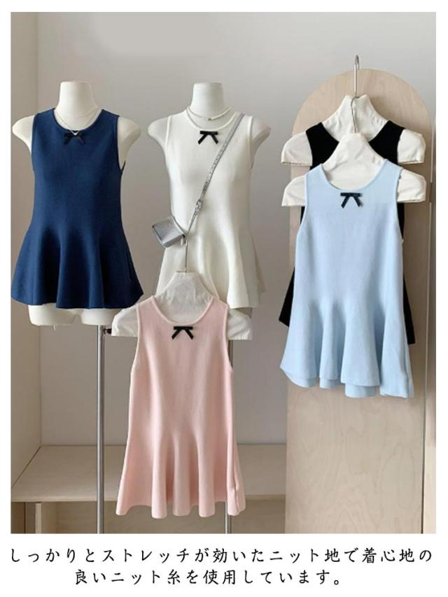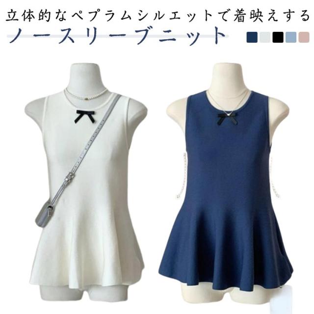 リボン ペプラムニット 丸首 サマーニット 薄手 トップス 袖なし フレア ベスト ストレッチ きれいめ ノースリーブニット スリム 細身 シンプル 大人可愛い