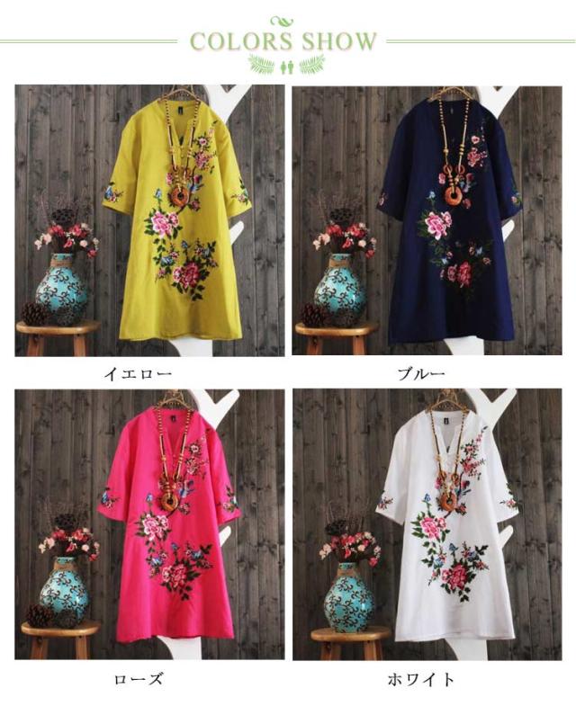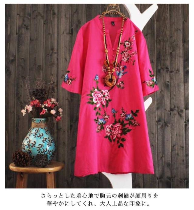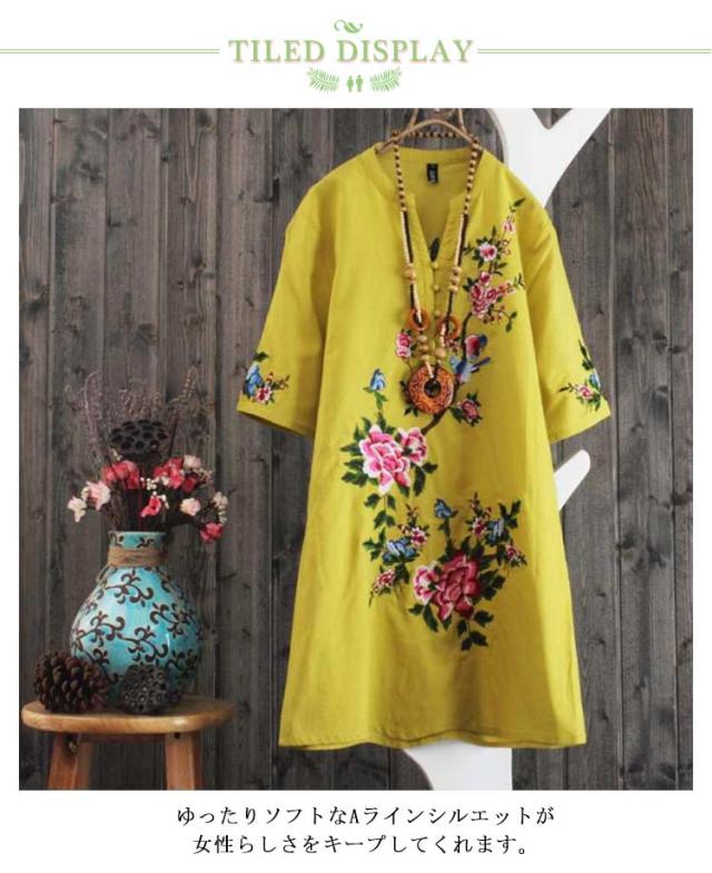 アジアン 刺繍ワンピース 送料無料 花柄 刺繍 ワンピース チュニック シャツワンピース 半袖 カジュアルワンピース エスニックワンピース 春夏 ミディアム レトロ かわいい トレロ 着るだけで雰囲気高まる 民族 ナチュラル