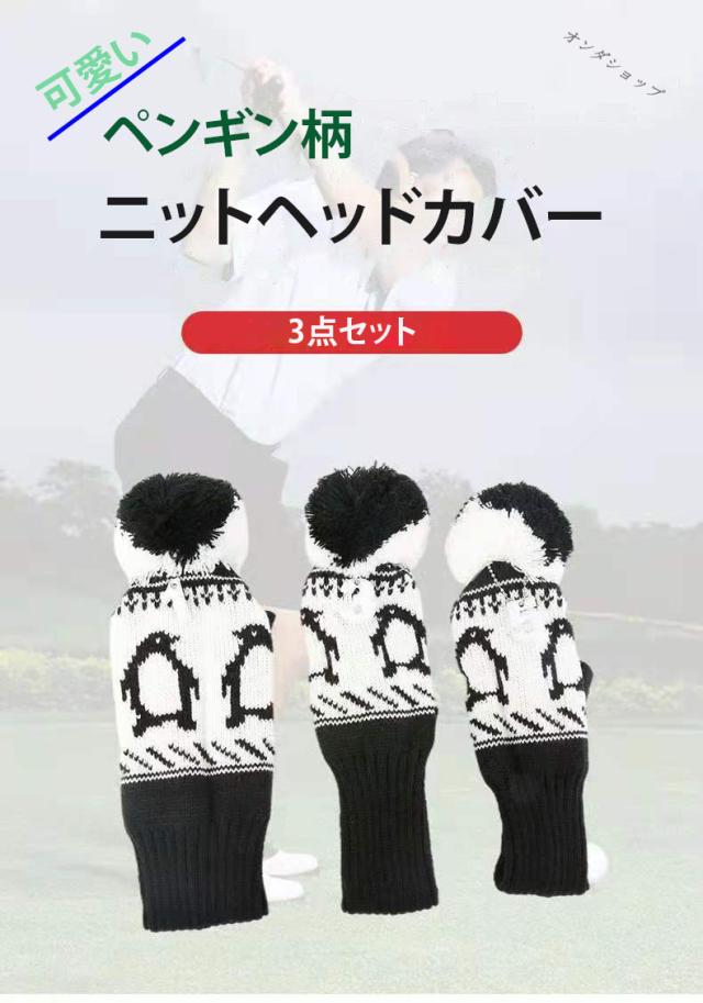 ゴルフドライバーカバー ニットヘッドカバー ペンギン柄 ヘッドカバー 動物柄カバー 可愛い ゴルフ用品 ゴルフクラブ ニット製 3点セット 番手付き