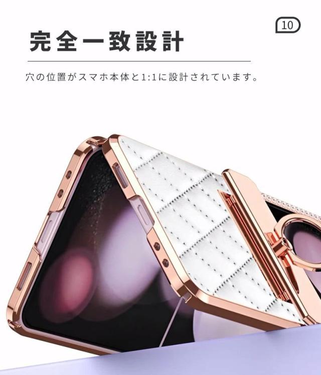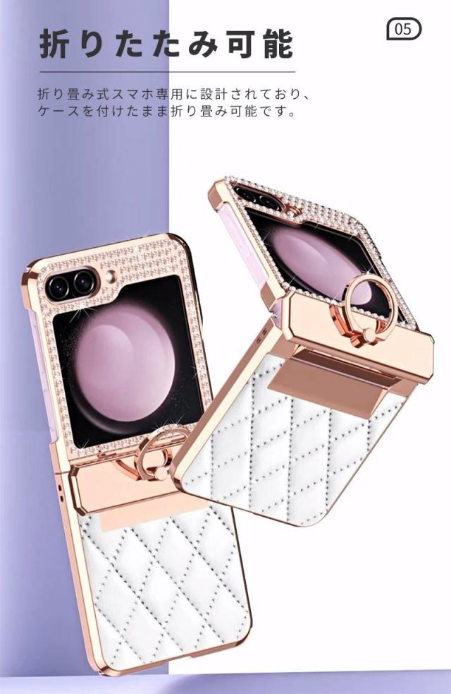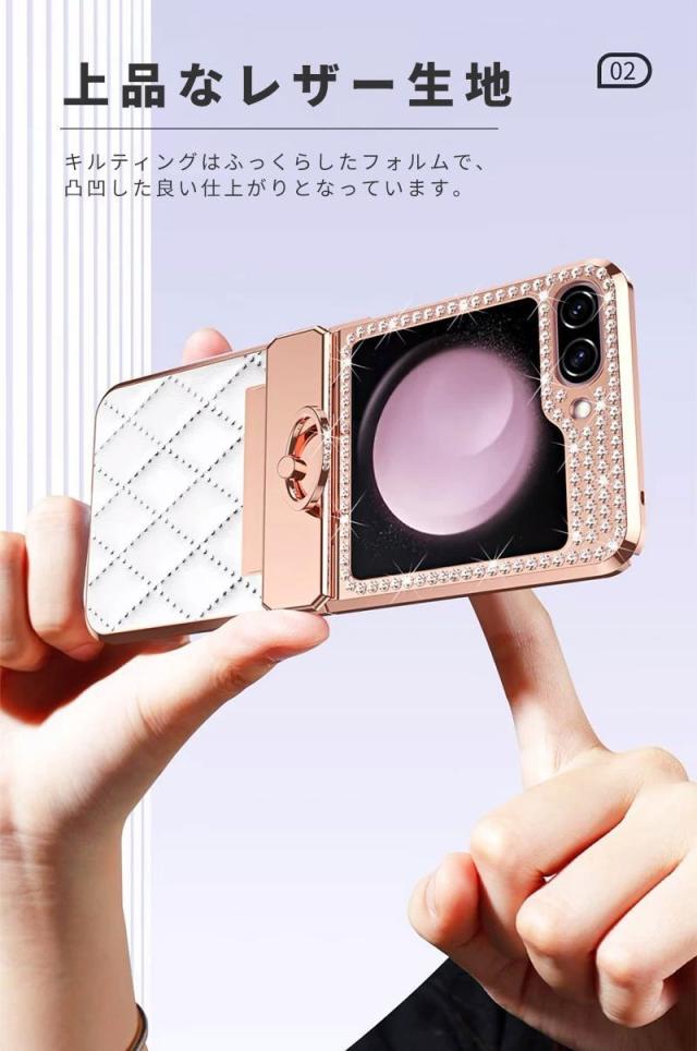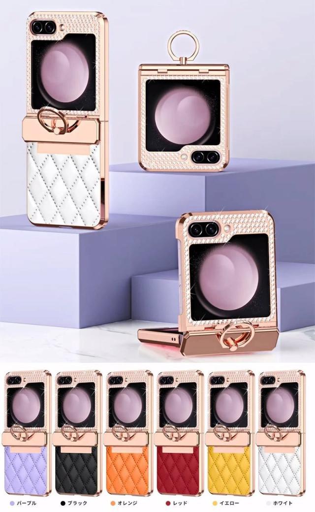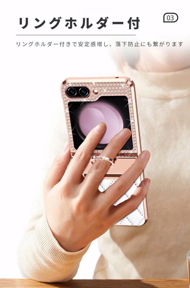 対応機種 Galaxy Z Flip7 Galaxy Z Flip6 5G(SCG29/SC-54E) Galaxy Z Flip5 SC-54D SCG23 Galaxy Z Flip4 SC-54C SCG17 Galaxy Z Flip3 SCG12 SC-54B 素材:PUレザー+PC 【機能】: ・折りたたみ式 180°に折りたたむことができるスマホケースです。 ・メッキ加工仕上げ ケースのサイドにはメッキ加工と精密なデザインで高級感を演出した仕上がり。 ・ラインストーンでオシャレ度UP キラキラして、とってもかわいい〜 オシャレな外観で、人目を引くこと間違いなしです。 ・ヒンジ保護 ヒンジ保護カバー付きで、ヒンジが傷つくのを防ぎます。 ・背面リング付き 背面リング付きで安定感増し、落下防止にも繋がります。 ※画像は一例となります。購入前に必ずお手持ちの機種をご確認ください。