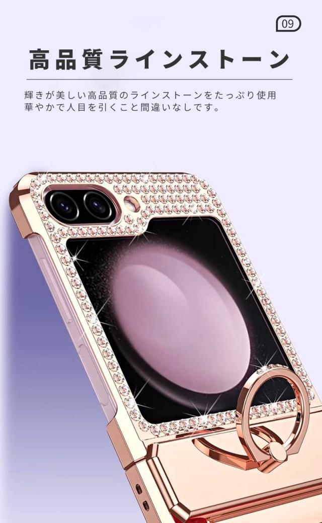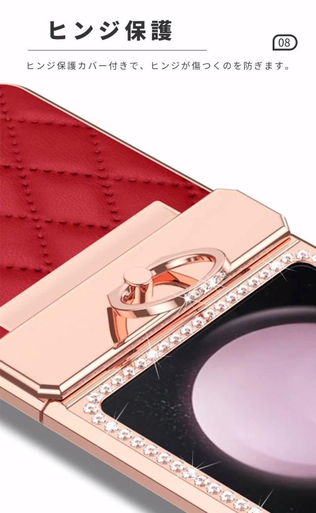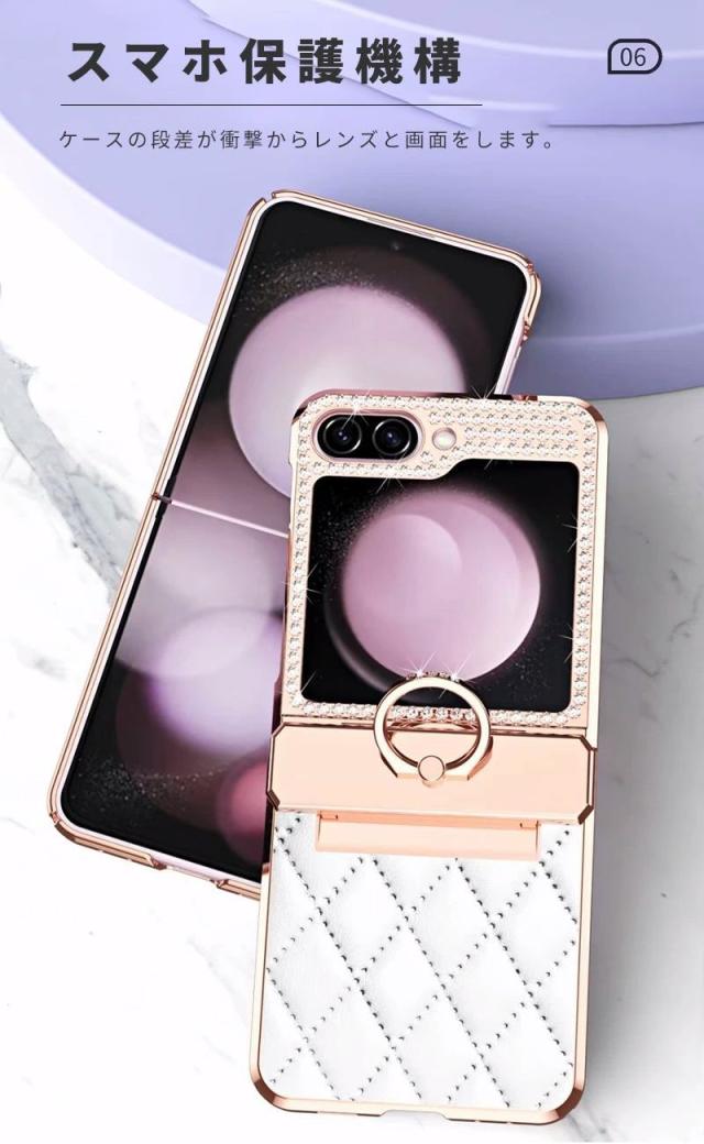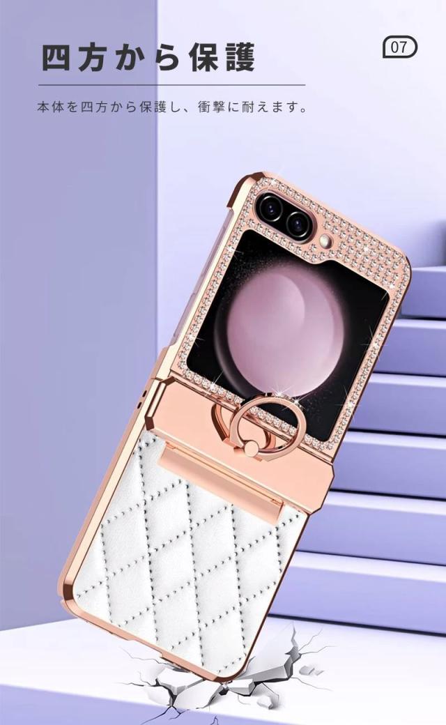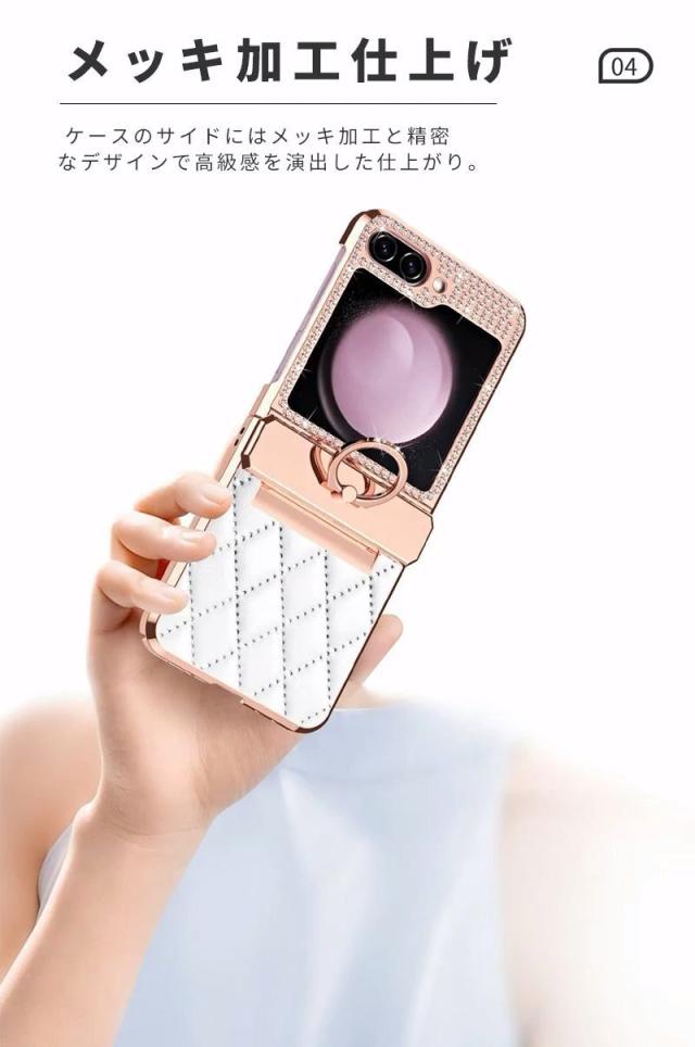 対応機種 Galaxy Z Flip7 Galaxy Z Flip6 5G(SCG29/SC-54E) Galaxy Z Flip5 SC-54D SCG23 Galaxy Z Flip4 SC-54C SCG17 Galaxy Z Flip3 SCG12 SC-54B 素材:PUレザー+PC 【機能】: ・折りたたみ式 180°に折りたたむことができるスマホケースです。 ・メッキ加工仕上げ ケースのサイドにはメッキ加工と精密なデザインで高級感を演出した仕上がり。 ・ラインストーンでオシャレ度UP キラキラして、とってもかわいい〜 オシャレな外観で、人目を引くこと間違いなしです。 ・ヒンジ保護 ヒンジ保護カバー付きで、ヒンジが傷つくのを防ぎます。 ・背面リング付き 背面リング付きで安定感増し、落下防止にも繋がります。 ※画像は一例となります。購入前に必ずお手持ちの機種をご確認ください。