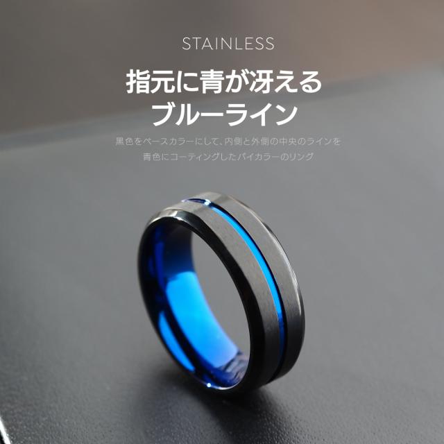 ブラックカラーにブルーラインが映えるステンレスリングです。シンプルな指輪の角を斜めにカットし、中央に溝を1周入れ、溝と内側をブルーにコーティングした指輪。内側がフラットではなく、曲面になっている内甲丸仕上げなので、装着がしやすく、着け心地もとても良い。シンプルなリングなので、使い勝手も良く、カジュアルな服装に相性が良いデザイン。ステンレス製で傷がつきにくく、使いやすいのも特徴。金属アレルギーの心配も少なく、つけっぱなしもOK。