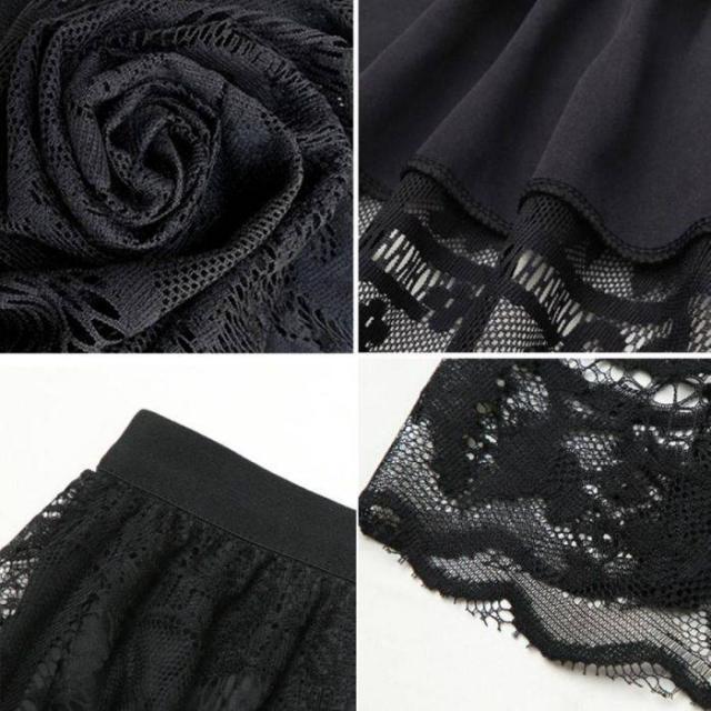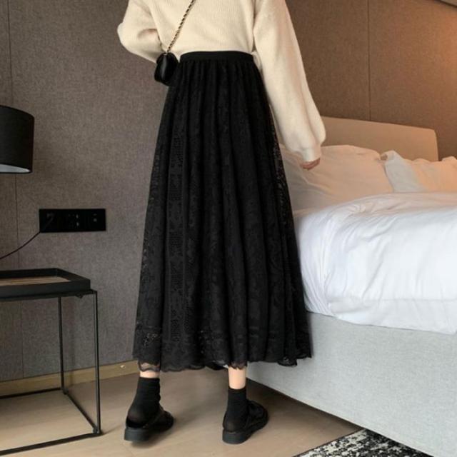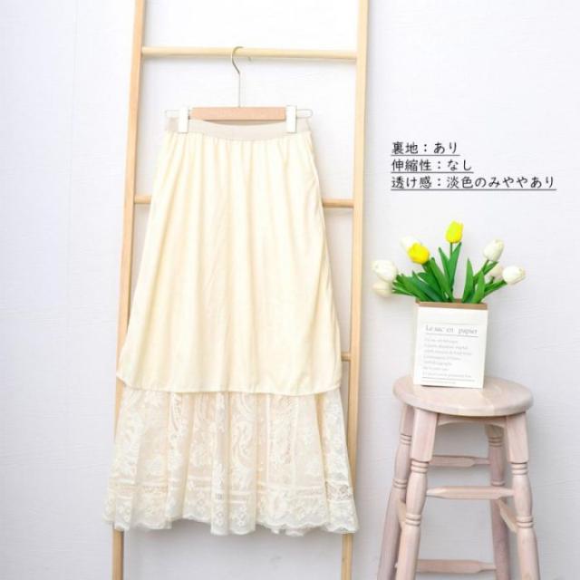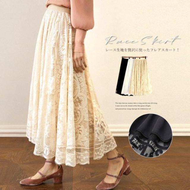 フレアスカート ウエストゴム シースルースカート 裏地付き エレガント ミモレスカート 韓国 フラワーレース お洒落