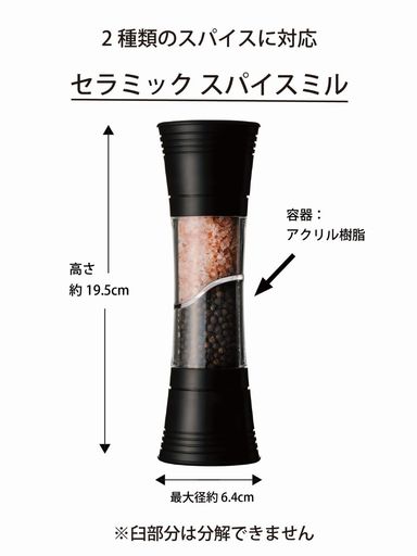 素材・材質:刃/セラミック磁器、本体/アクリル樹脂、ポリプロピレン、粗さ調節つまみ/ポリアセタール、ミルユニット/ポリプロピレン