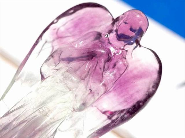 フローライト エンジェル 彫刻置物 美しい大天使をモチーフにしたフローライト置物が入荷しました! パープルやグリーンなどカラーバリエーションが豊富なことで知られるフローライト! こちらはブルーグリーンやパープルカラーのフローライトを使用しています。 ひとつひとつ色の入り方が異なるので、どれが届くかはお楽しみ。 細かな部分まで彫り込まれているので高級感がありますよ。 【意味合い・云われ・伝承等】 フローライトは『天才の石』とも称される事もあり、大人になるにつれて固定化されてきた思考パターンや抑圧された感情から自分自身を解き放つ為に働き、子供の頃の自由で無邪気な発想や思考力を高めてくれると云われています。 また、脳を活性化させて思考の幅を拡げ、受験のお守りになるなどの云われもあります。 天使をモチーフにした置物は、気を浄化する作用があり、マイナスな気を消す効果があると云われています。 玄関に置くことで、悪い気を寄せつけない魔除け的な役割も果たしてくれるそうですよ。 |