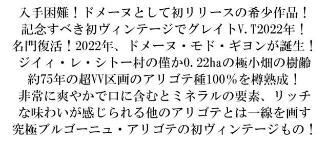 入手困難!ドメーヌとして初リリースの希少作品! 記念すべき初ヴィンテージでグレイトV.T2022年! 名門復活!2022年、ドメーヌ・モド・ギヨンが誕生! ジイィ・レ・シトー村の僅か0.22haの極小畑の樹齢 約75年の超VV区画のアリゴテ種100%を樽熟成! 非常に爽やかで口に含むとミネラルの要素、リッチ な味わいが感じられる他のアリゴテとは一線を画す 究極ブルゴーニュ・アリゴテの初ヴィンテージもの!