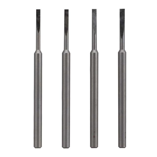 同径のドリル刃であけた穴の底面 (ドリル刃加工)を平坦にする事ができます 軸サイズ3mmに統一 刃部サイズ1.6mm、1.7mm、1.8mm、1.9mm 薄刃の彫刻刀としても使用可能