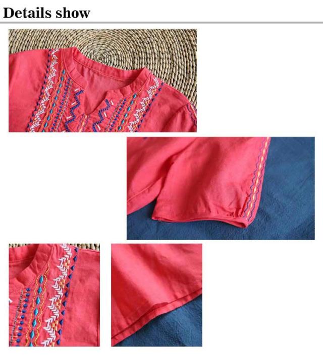 綿麻ブラウス エスニック ブラウス 5分袖 森ガール カットソー シャツ トップス 刺繍 綿麻チュニック レディース スキッパー 大人女性 半袖 夏 キーネック プルオーバー 刺しゅう チュニック オーバーサイズ 体型カバー 送料無料