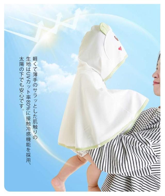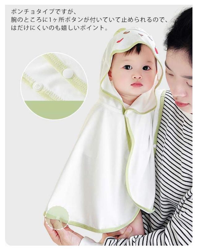 | 春先・秋口の防寒や、夏の冷房対策に最適なベビーケープ 軽くて薄手のサラッとした肌触りの生地はUVカット率80%に接触冷感機能を採用、太陽の下でも安心です。 屋内でもエアコンの冷たい風から赤ちゃんの肌を守り、体温調節にも最適。 ポンチョタイプですが、腕のところに1ヶ所ボタンが付いていて止められるので、はだけにくいのも嬉しいポイント。 さっと羽織れて、着せた時のシルエットがとっても可愛いアイテムです。 出産祝いのプチギフトにもオススメです。 | |