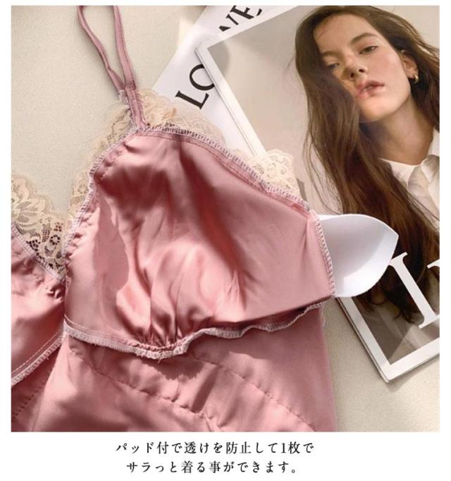 | 着ているだけで女子力がアップするランジェリーです。 滑りの良い素材だから洋服のシルエットを美しく見せてくれます。 胸元のレースはセクシーで大人の女らしさを演出してくれます。 パッド付で透けを防止して1枚でサラっと着る事ができます。 普段使いはもちろん、部屋着など幅広くお使いいただけます。 | |