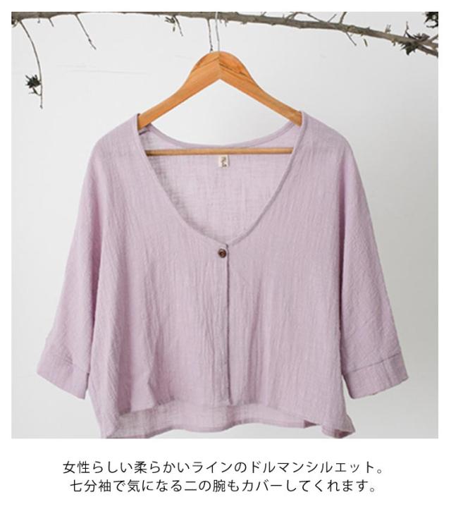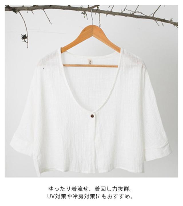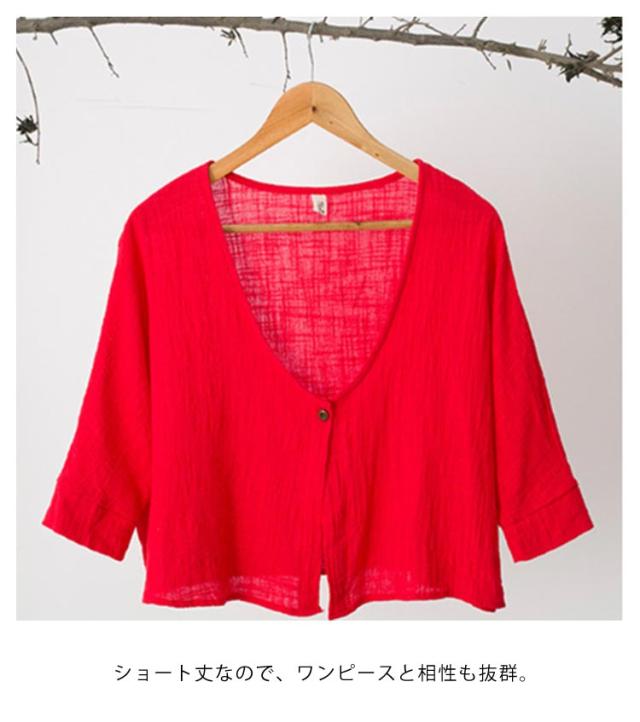 | 夏に一枚あると重宝するボレロカーディガン。 透け感のある独特な風合いを楽しめる、ボレロカーディガン。 ちょっと肌寒い時や、室内の冷房対策にも使えます。 ゆったり着流せ、着回し力抜群。 UV対策や冷房対策にもおすすめ。 女性らしい柔らかいラインのドルマンシルエット。 七分袖で気になる二の腕もカバーしてくれます。 ショート丈なので、ワンピースと相性も抜群。 | |