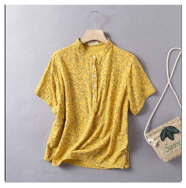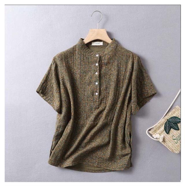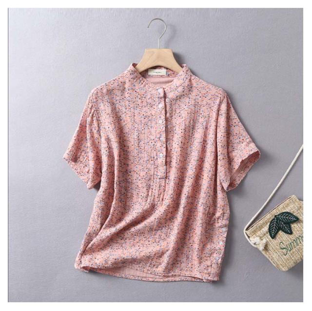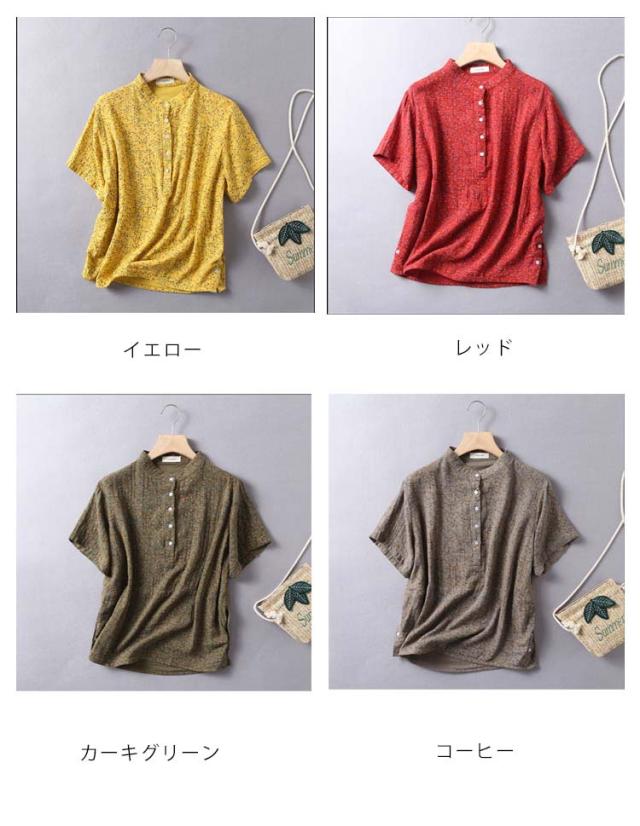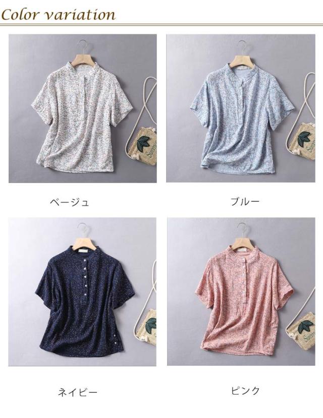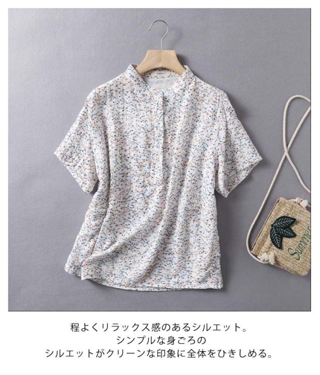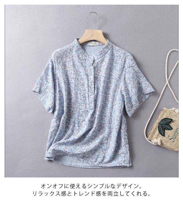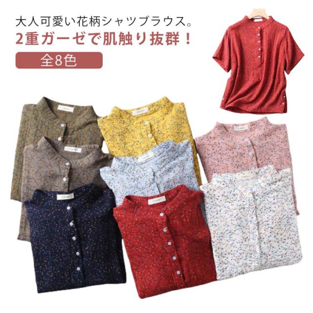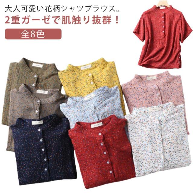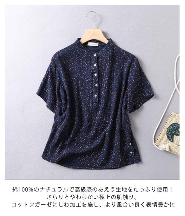 Tシャツ ブラウス 2重ガーゼ 花柄 半袖 レディース 夏 春 ガーゼシャツ 綿100% シャツ 半袖シャツ トップス キレイめ 立ち襟 無地 コットン100% ゆったり 綿100% スタンドカラー ゆるシルエット エレガント 柔らか ダブルガーゼ