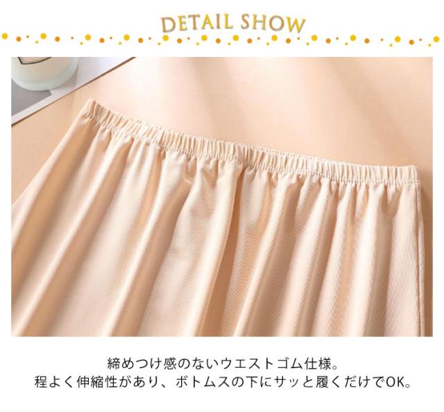| シンプルで使いやすいデザイン、ボトムスインナーに大活躍間違いナシのペチコート♪ 透け感のあるスカートやワンピース着用時の必須アイテムです。 一年を通してサラッと爽やかに、快適にお過ごし頂けます。 ウエスト部分は細めのゴム仕様なので着膨れしません。 ストレッチサテンなので伸縮性があり着用感もばっちりです◎ インナーが透けにくく、シンプルデザインでアウターの邪魔をしない。 中に一枚着るだけでおしゃれをもっと楽しむことができます。 | |