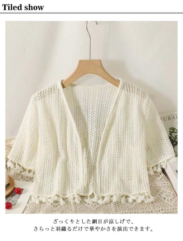 サマーカーディガン 大人可愛い タッセル シアー 半袖 透かし 夏用 レディース ショート丈 カーデ 透かし編み トップス ボレロ 羽織り 長袖 ボタンなし 薄手 透け感 UVカット 冷房対策 春夏 透かし編みカーデ おしゃれ 半袖 海辺 ビーチ リゾート