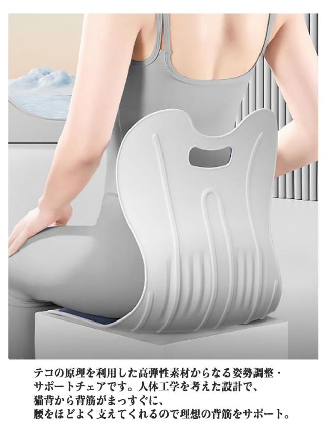 | 車シート、椅子や床に置いて座るだけで猫背改善!大人用姿勢矯正椅子。 テコの原理を利用した高弾性素材からなる姿勢調整・サポートチェアです。人体工学を考えた設計で、猫背から背筋がまっすぐに、腰をほどよく支えてくれるので理想の背筋をサポート。 【姿勢調整】人間工学に基づた設計で腰椎をしっかりと支え、腰の疲労感を軽減し健康な脊椎ラインを維持します。 【骨盤を安定させてくれる座面】本製品は骨盤の形状やサイズを考慮し、設計されています、骨盤を左右から支えることで安定させます。 【超強弾性】クッション材には、ウレタンを使用。弾力性に優れ、もちもちとした感触が腰とお尻を包みます。 【表地】側地はポリエステル100%さらっと滑らかな触り心地で快適に使用できます。 【軽量設計】片手でも楽々持てる軽さなので、家の中でも車の中でも持ち運びが簡単でいろんな場所で使えます。 | |