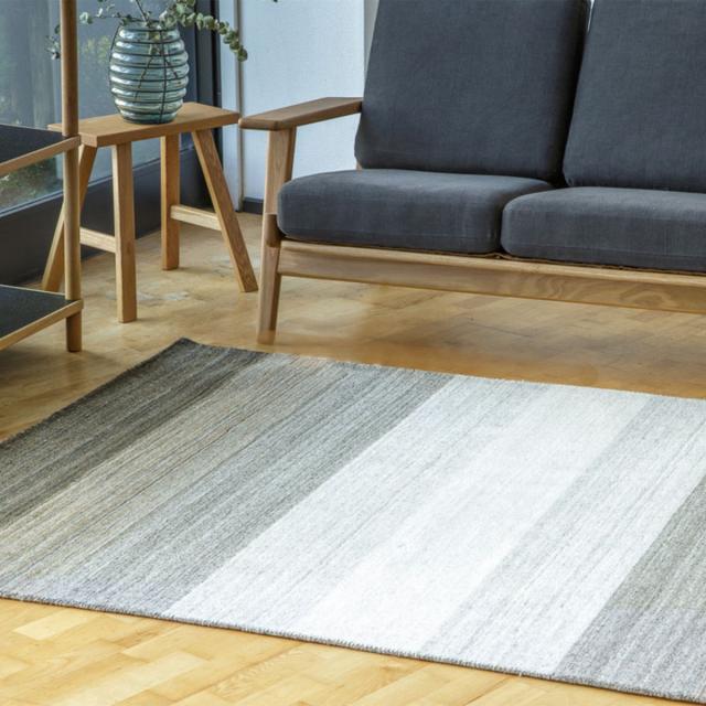 線状のグラデーションが特徴的なモダンなラグです。シンメトリーで広がる繊細なラインのグラデーションデザインが、シックで上質な空間を演出します。北欧インテリアとの相性もよく、コーディネイトの幅も広がります。