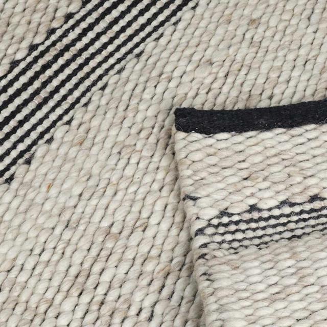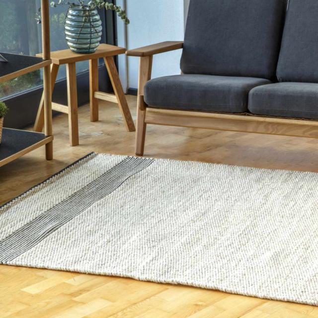 サイドのラインがスタリッシュな手織りのラグです。お部屋に馴染むシンプルなデザインなので北欧インテリアはもちろん、どんな雰囲気のインテリアともマッチします。インテリアの邪魔になりにくいカラーで使い勝手が良い1枚です。