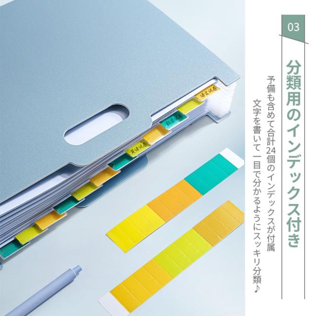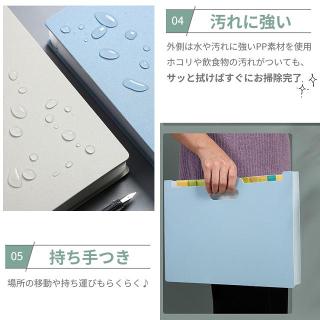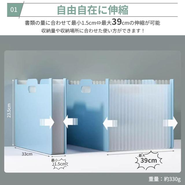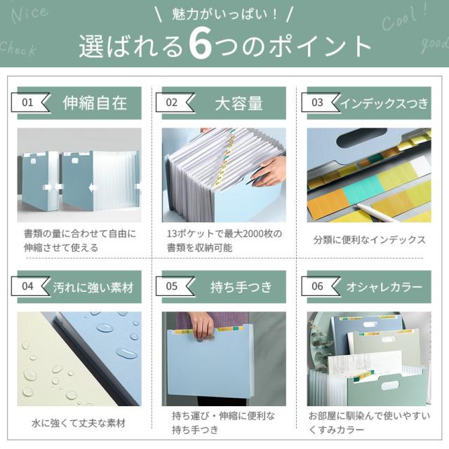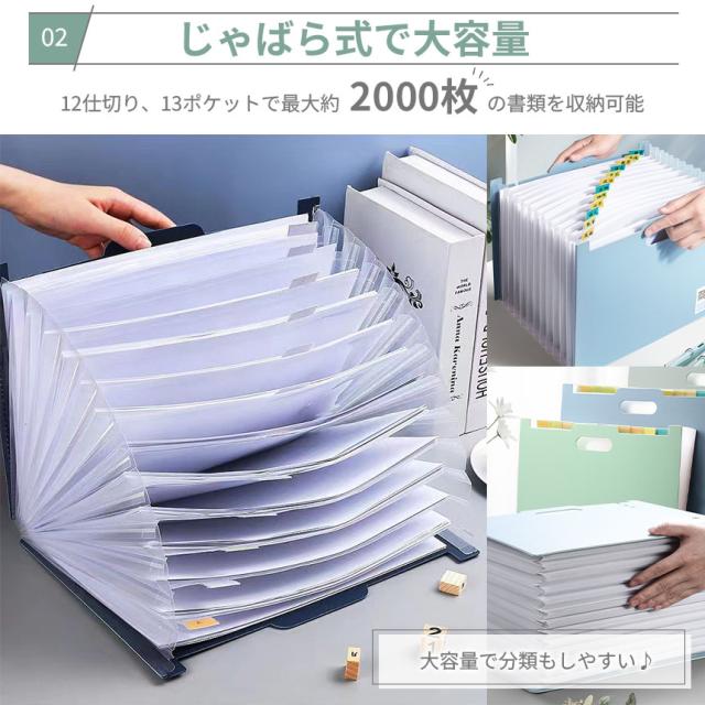 【書類整理に】仕事で使う資料や紙データ、電化製品の取り扱い説明書、領収書、子供の宿題、学校からの案内など、日々増えていく書類の整理にお困りの方におすすめの商品です。じゃばら式で最大約2000枚の書類を収納可能な大容量ドキュメントファイルです。ポケットも13か所あり、種類ごとに分類が可能です。【自由自在に伸縮】書類の数に合わせて最小1.5cm⇔最大39cmまで伸縮可能です。収納量や使用場所に合わせて調整してお使いいただけます。※最小、最大サイズは伸縮させる際の力加減によって誤差が生じます。【インデックスつき】予備も含めて24×2個のインデックスが付属しています。書類の種類がわかりやすいように分類できます。