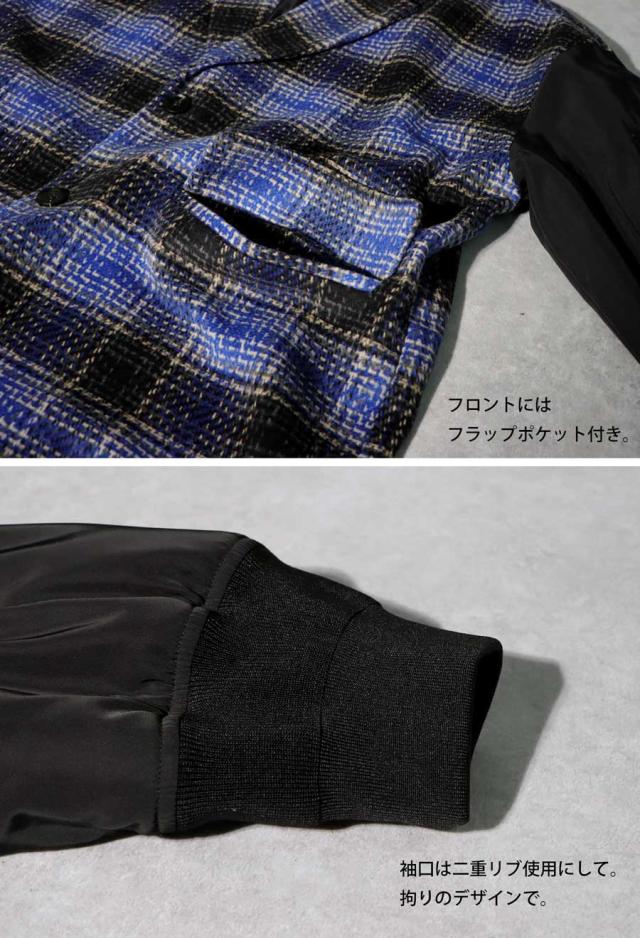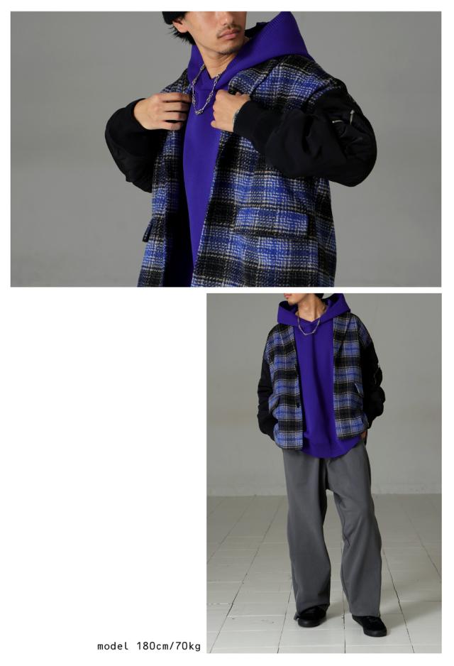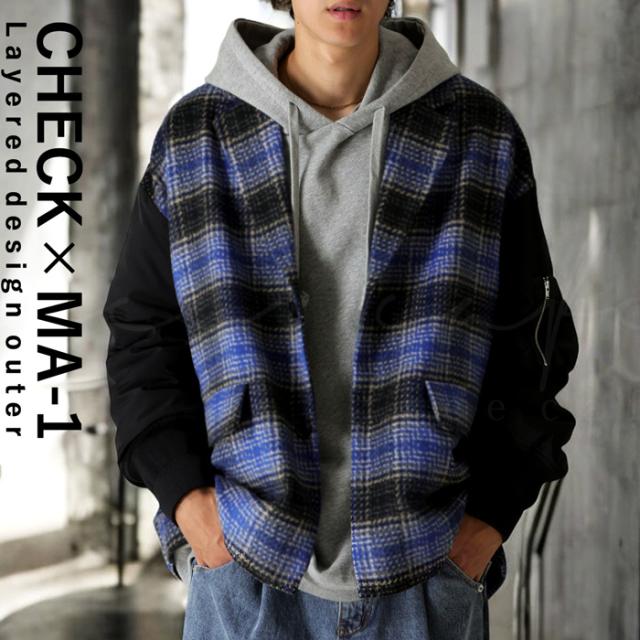 yz-00092z 柄アウター 柄 チェック柄 MA-1 切り替え ドッキング ボリューム袖 MA-1風 ポケット付き 前後差 ゆったり マニッシュ モード オーバーサイズ 大きめ ユニセックス