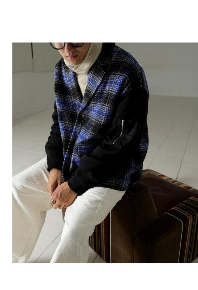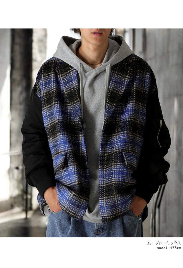 起毛感のあるチェック柄と、MA-1の袖がドッキングされたカジュアルなアウター。