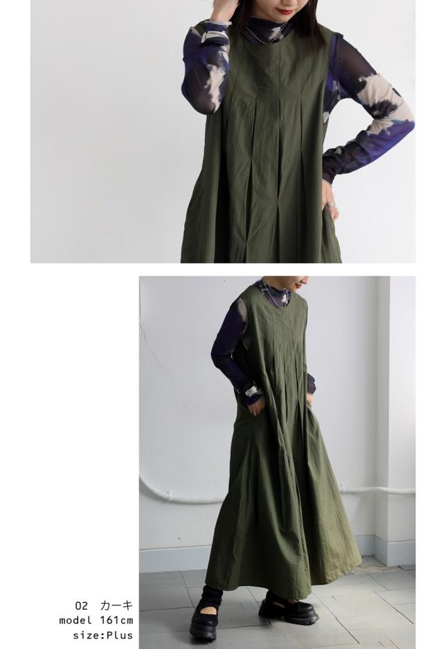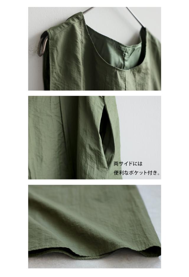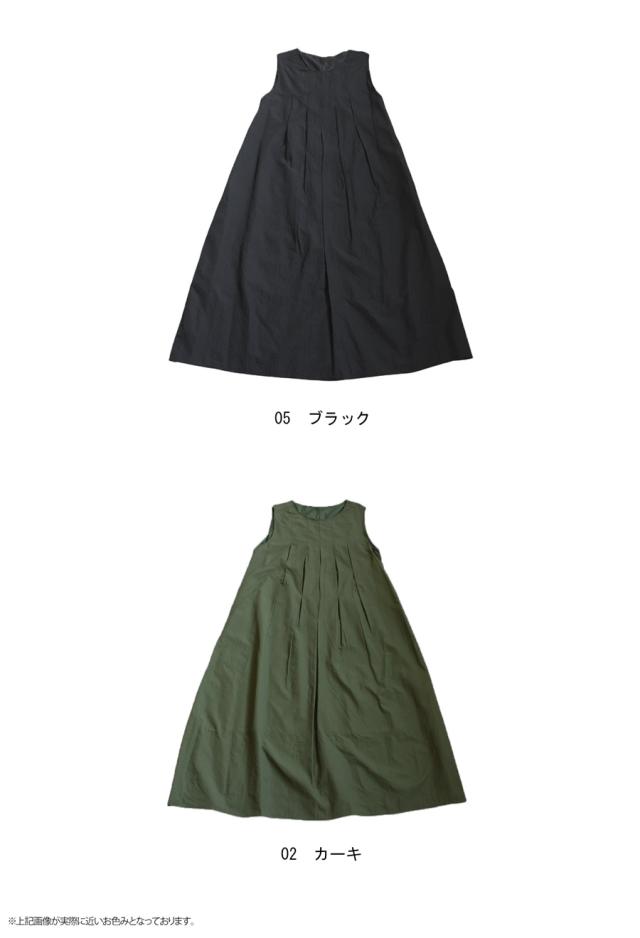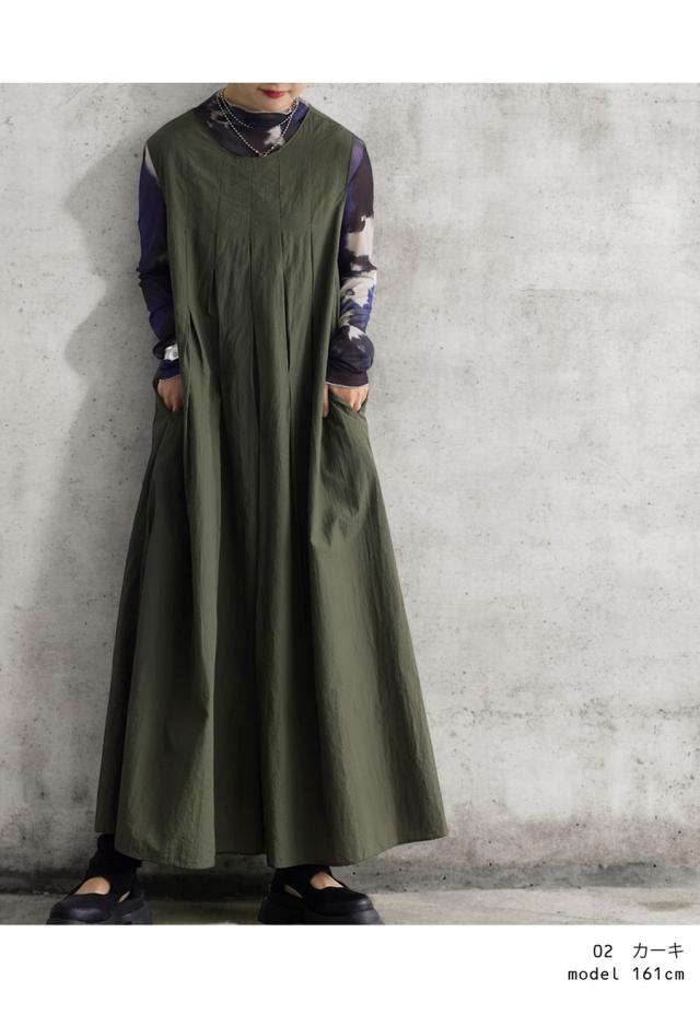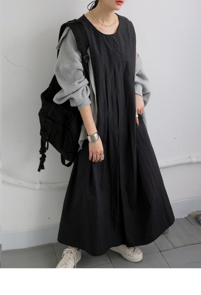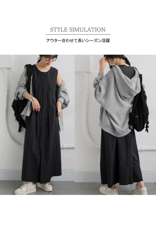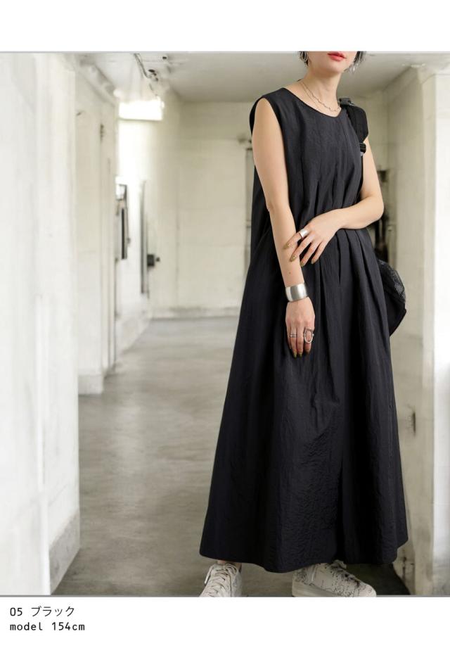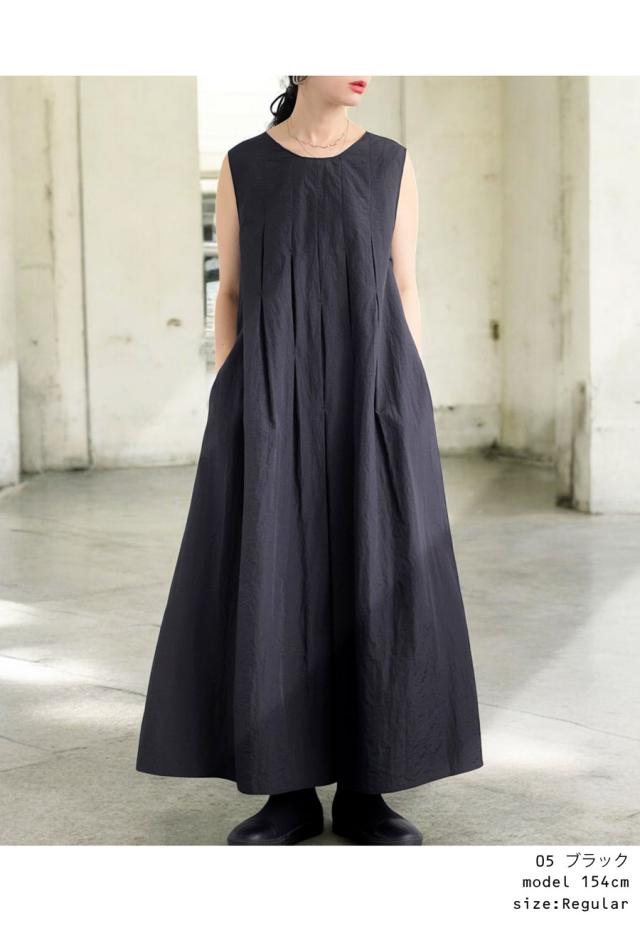 pa-03708 ロング 無地 ノースリーブ 袖なし 丸首 ラウンドネック プルオーバー ポケット付き タック ゆったり ナイロン シンプル きれいめ 上品