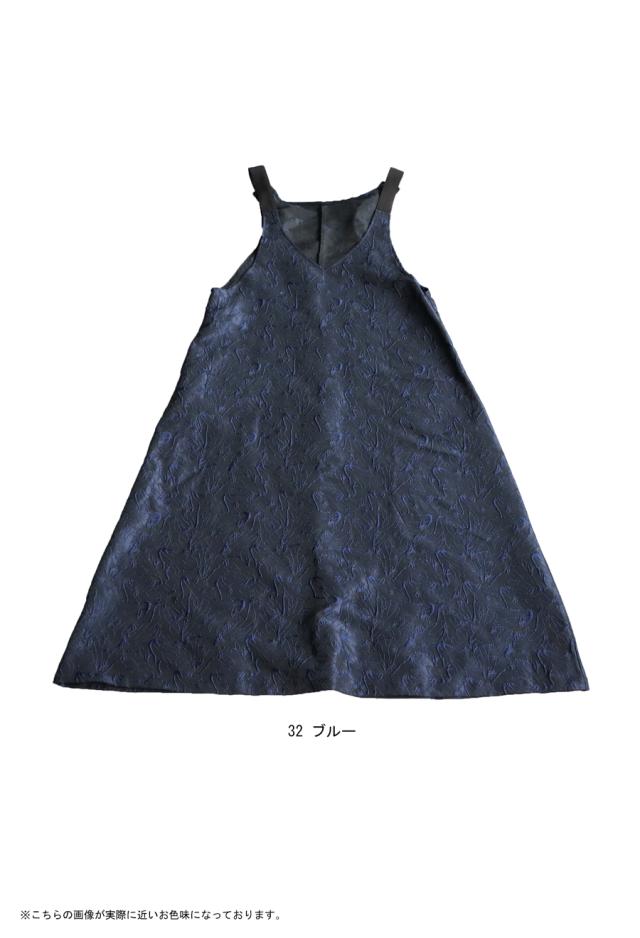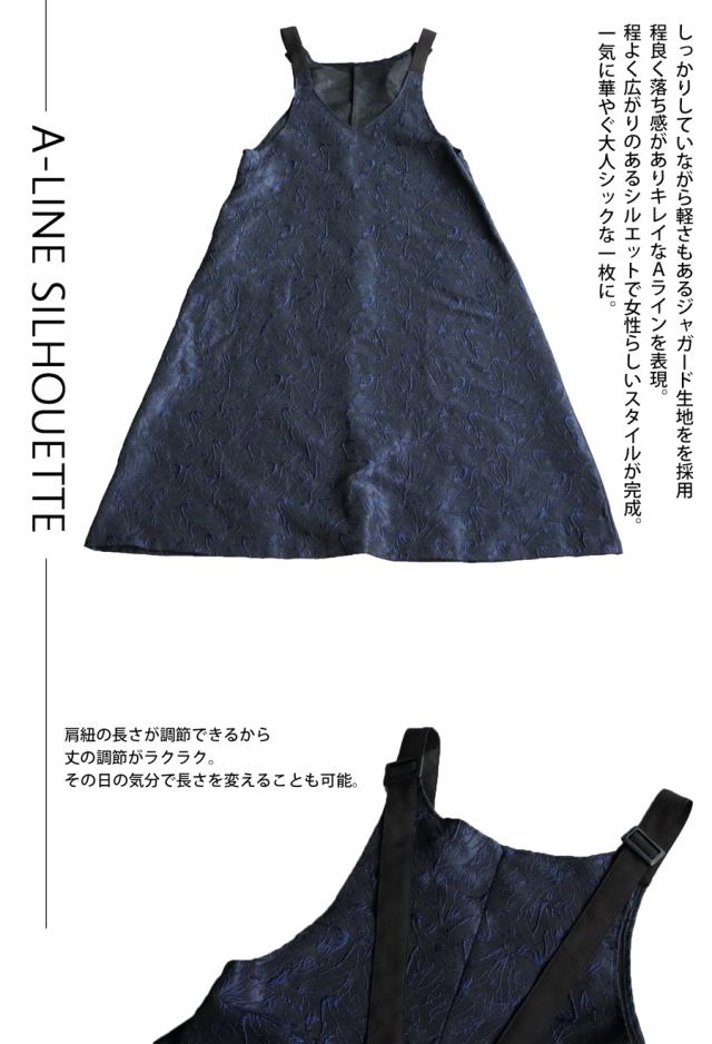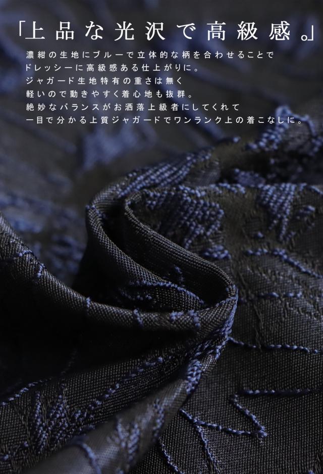 濃紺をベースにブルーの刺繍が目を惹く、ジャガード生地ワンピース。