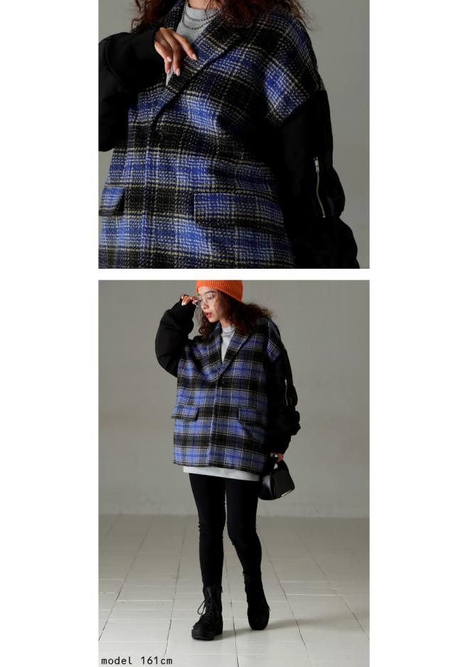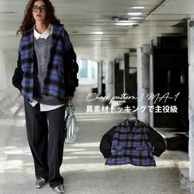 yz-00092 柄アウター 柄 チェック柄 MA-1 切り替え ドッキング ボリューム袖 MA-1風 ポケット付き 前後差 ゆったり マニッシュ モード オーバーサイズ 大きめ ユニセックス