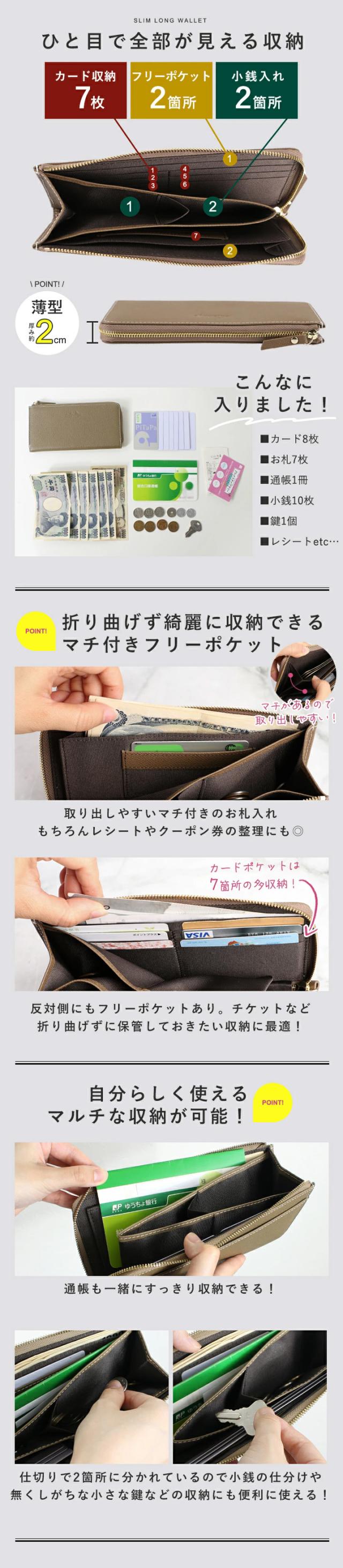 小銭入れ×2、カード入れ×7、フリーポケット×2、背面ポケット×1、開閉:ファスナー