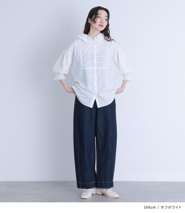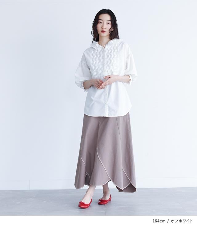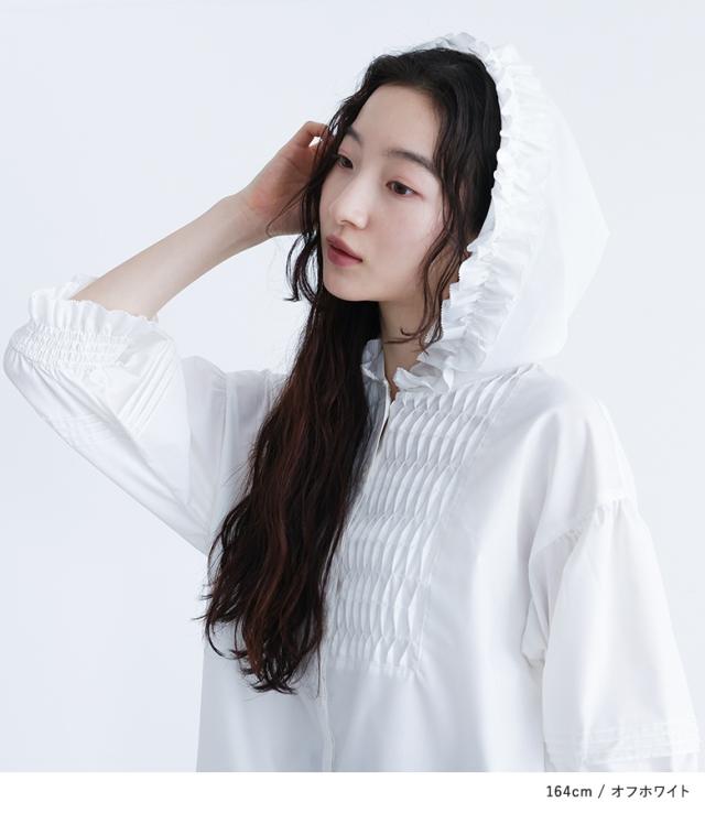 ■デザイン ピンタックをジグザグに倒し、スモッキング風に見せたブザム切り替えがポイントのブラウス。フリルをあしらったフードで後ろ姿まで印象的に。袖にもピンタックを施し、袖口はフリルゴムシャーリングでぽわんとしたシルエットが女性らしい一枚です。 ■素材 滑らかで肌触りの良いシャツ生地。さらっとした軽い着心地の生地です。 ※オフホワイトはやや透け感がございますのでインナーのご着用をおすすめいたします。 ■コーディネート 女性らしい印象のピンタックブラウスはデニムやチノパンツなどカジュアル、またはメンズライクなアイテムでバランスをとった着こなしがおすすめです。甘くなり過ぎず大人っぽく着こなしていただけます。きれいめスカートに合わせた上品なスタイリングも◎ |