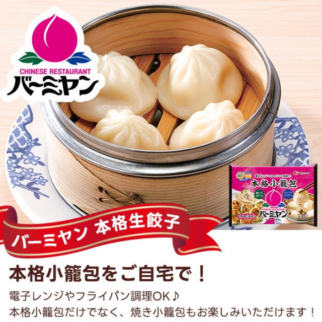 【バーミヤン本格小籠包】具(豚肉(輸入・国産)、たまねぎ(国産)、おろししょうが、しょうゆ、香味油(植物油脂、白ねぎ、たまねぎ)、ゼラチン、砂糖、ごま油、しいたけ、食塩、チキンスープ)、 皮(小麦粉、調製ラード、食塩)/調味料(アミノ酸等)、アルコール、(一部に小麦・ごま・大豆・鶏肉・豚肉・ゼラチンを含む)