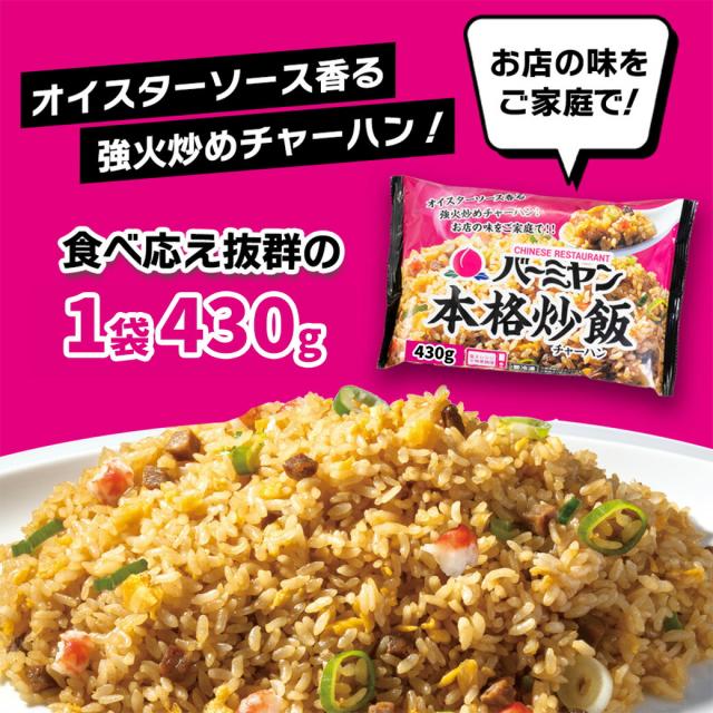 【バーミヤン本格炒飯】米(国産)、液卵、焼豚、かに風味かまぼこ、みりん、ねぎ、ショートニング、食塩、しょうゆ、還元水あめ、ウスターソース、でん粉、ほたて貝エキス、オイスターソース、しょうがペースト、中華調味料、香辛料、ぶどう糖、いため油(なたね油、こめ油)/調味料(アミノ酸等)、加工でん粉、着色料(カラメル、紅麹、カロチノイド)、甘味料(カンゾウ、ステビア)、酸味料、貝Ca、(一部に小麦・卵・乳成分・ごま・大豆・鶏肉・豚肉を含む)