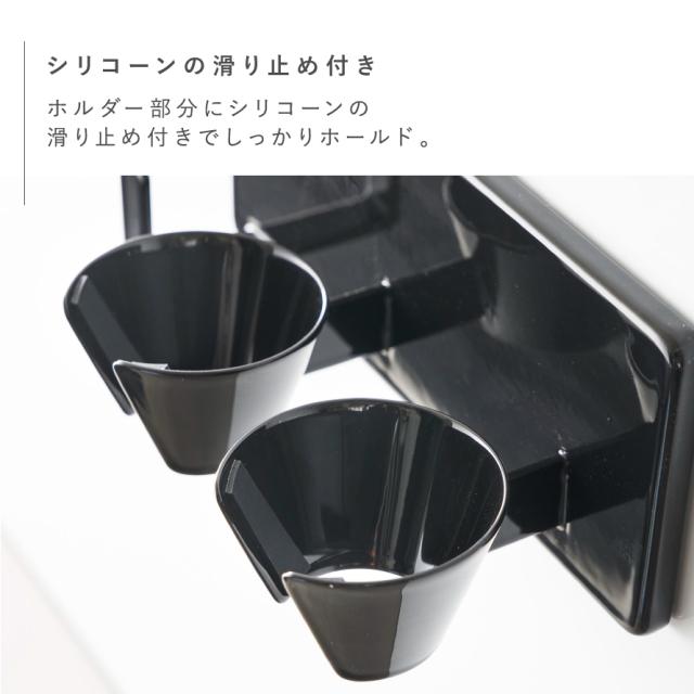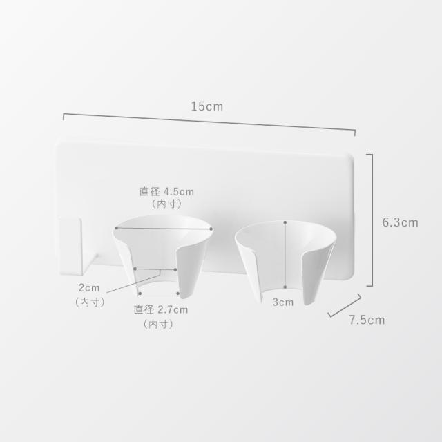 ■サイズ:本体/幅15×奥行7.5×高さ6.3、フィルムフック接着面/幅6×高さ6cm、内寸/ホルダー部/上部直径4.5cm・下部直径2.7cm・高さ3cm(1つあたり)、フック部/W1×D2.7×H2.7cm