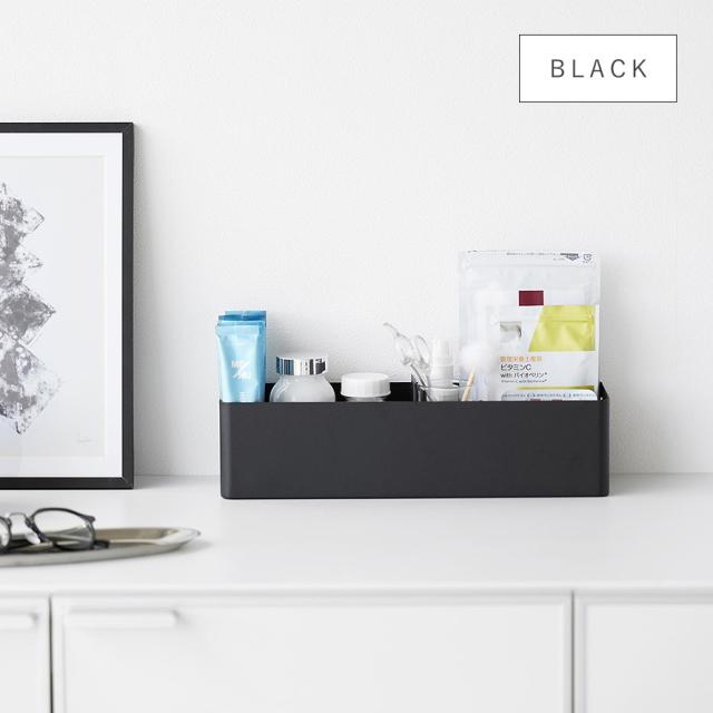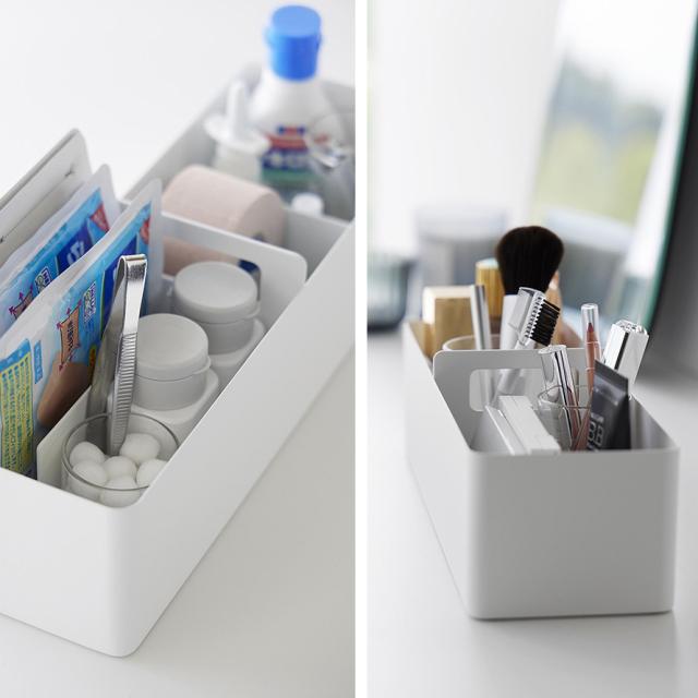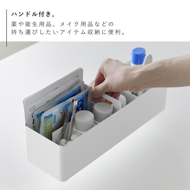 小物の収納に便利な、ハンドル付きのスリムなボックス。マグネット付きの可動式仕切りは、自由に仕切ることができるので小物やシートマスク、湿布なども収納しやすく便利。