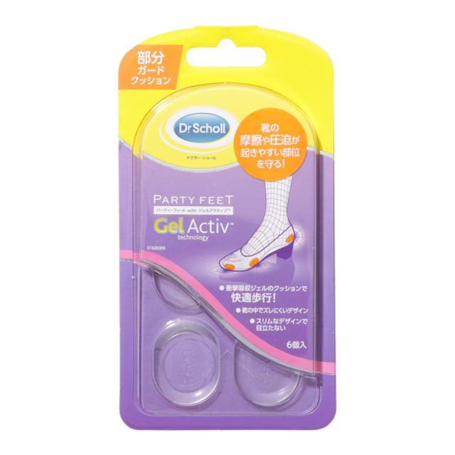「パーティーフィート ジェルスポットクッション6個入り」は、クッション性に優れた、透明ジェルのつま先・前すべり防止用靴の中敷です。