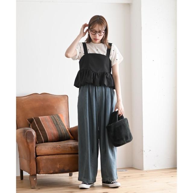 オーバーキャミとワイドパンツのトレンドライクなスタイリングが1枚で完成します。