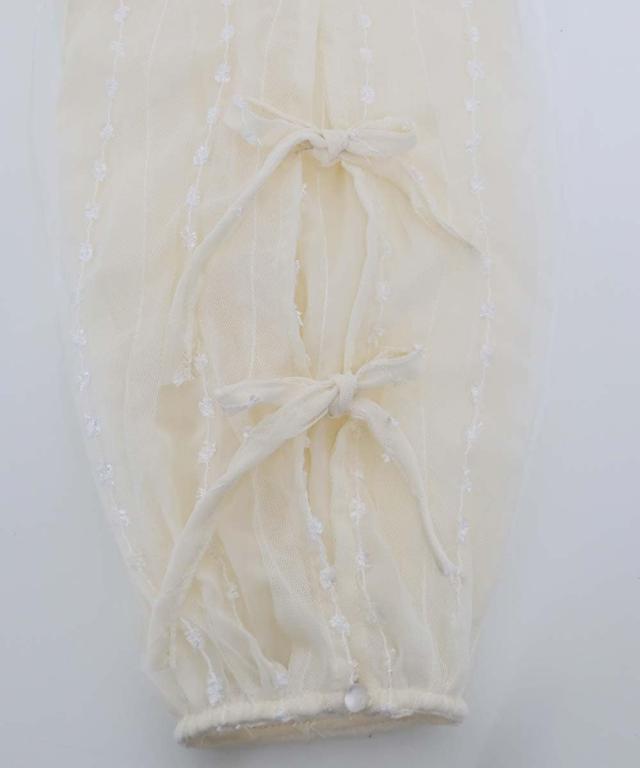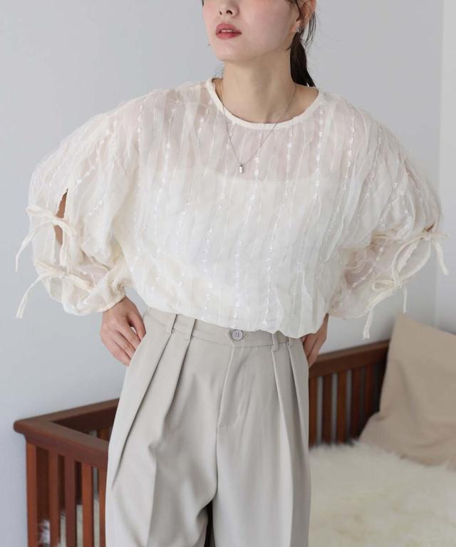 袖のスリットにリボンをあしらった、シアーチュールトップス。