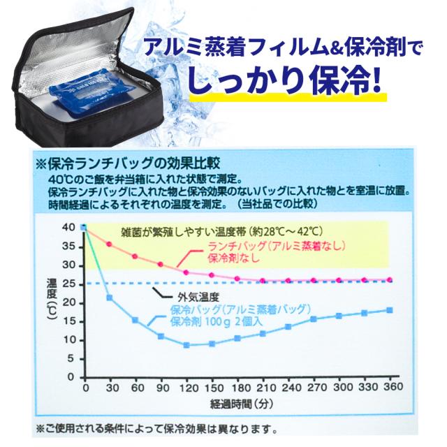 保冷効果◎バッグ本体は発泡ポリエチレンとアルミ蒸着フィルム素材が断熱・保冷効果を発揮。お弁当の温度上昇を防ぎます。