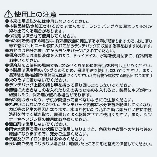 ご注意本製品は防水加工されておりませんので、ランチバッグ内に溜まった水分が染み出てくる場合があります。