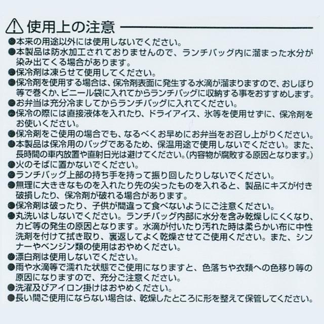 ご注意本製品は防水加工されておりませんので、ランチバッグ内に溜まった水分が染み出てくる場合があります。