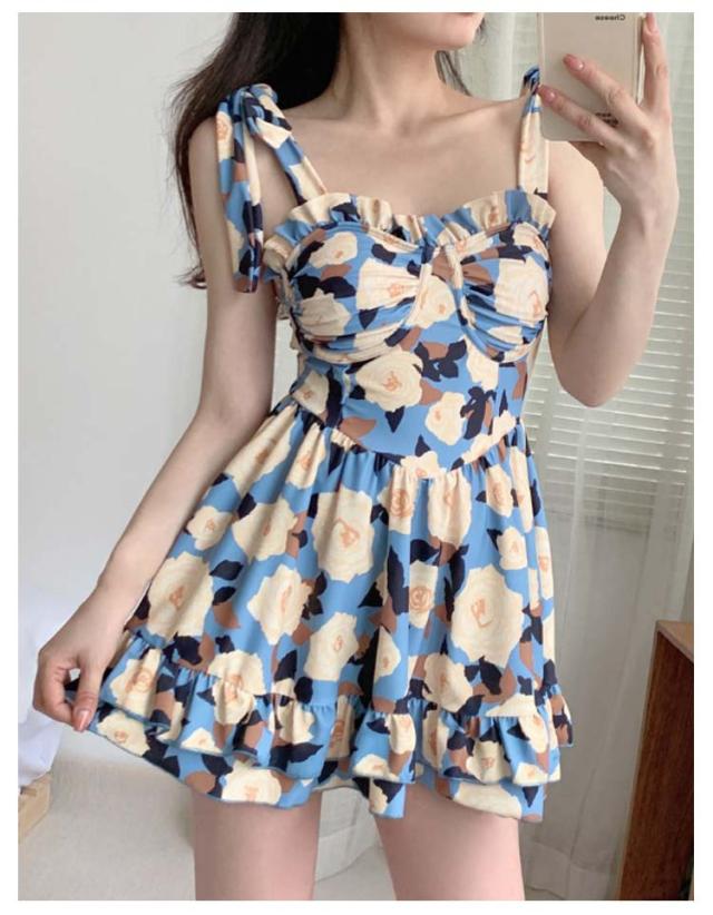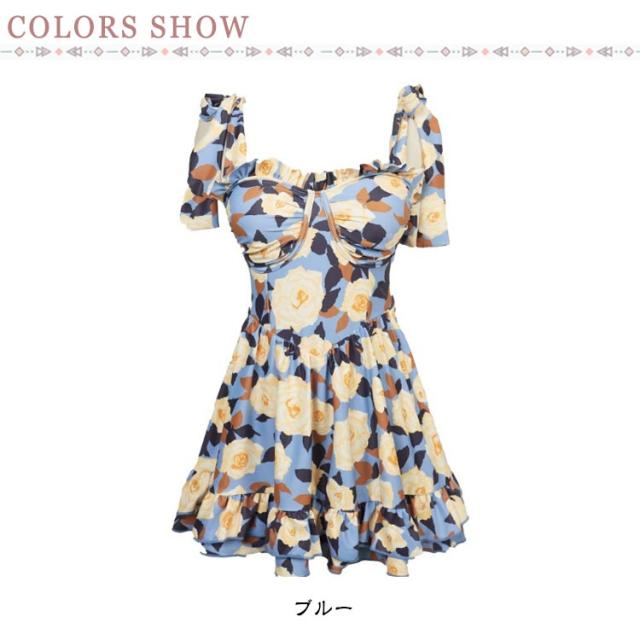 | 美しいバストをメイク♪ キャミワンピース水着、肩紐リボン結びで、自分にぴったりのサイズに調整可能。 デコルテのフリフリがかわいい。胸バッド付きで、綺麗なバストラインを◎ ふんわりフレアティアードスカート、お腹、ヒップなど気になる体ラインを美しくカバー。 人目を引く花柄、プールやビーチで大注目される間違いなし。 | |
