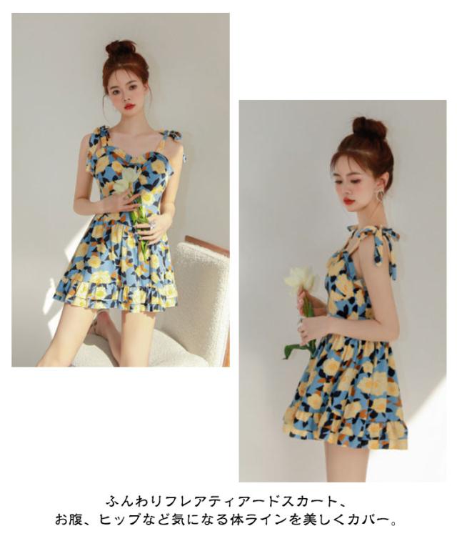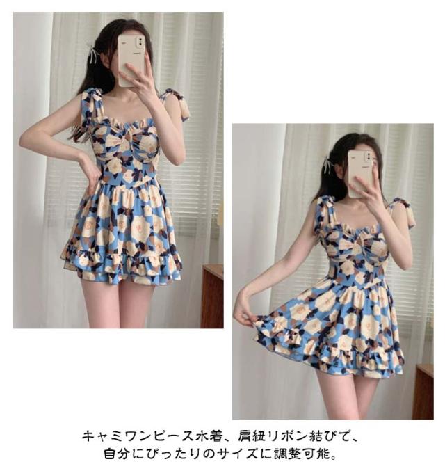 キャミワンピース水着 レディース 水着 ワンピース 体型カバー 可愛い フリル フレア 花柄 10代20代30代 露出控えめ ウエスト お尻 太もも カバー キャミワンピ スイムウェア ノースリーブ 肩紐調整可能 胸パッド付き きれいめ ガーリー 送料無料