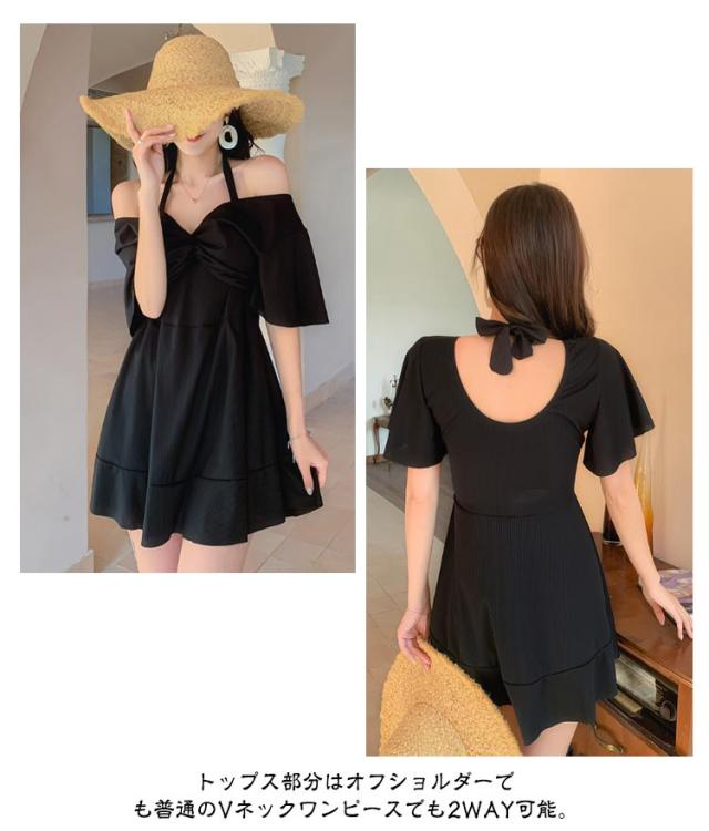 | セクシーでも上品でも♪一つで二つ表情の2WAYワンピース水着。 トップス部分はオフショルダーでも普通のVネックワンピースでも2WAY可能。 フリルスリーブは二の腕を隠してくれ、ギャザーを寄せた胸元デザインが美しいデコルテラインを演出。 ワイヤー入りインナーカップワンピース水着、バストをしっかりホールド!美バストを演出。 安心インナーパンツ付きでめくれても露出は抑えるのも嬉しいポイント! | |