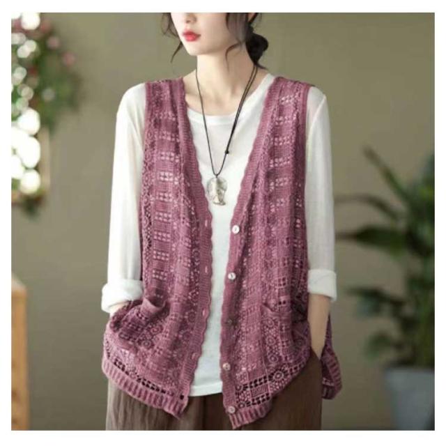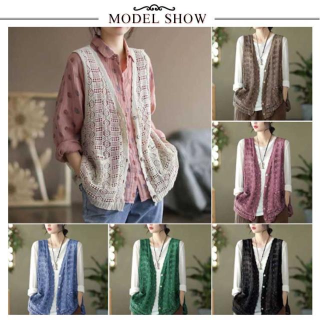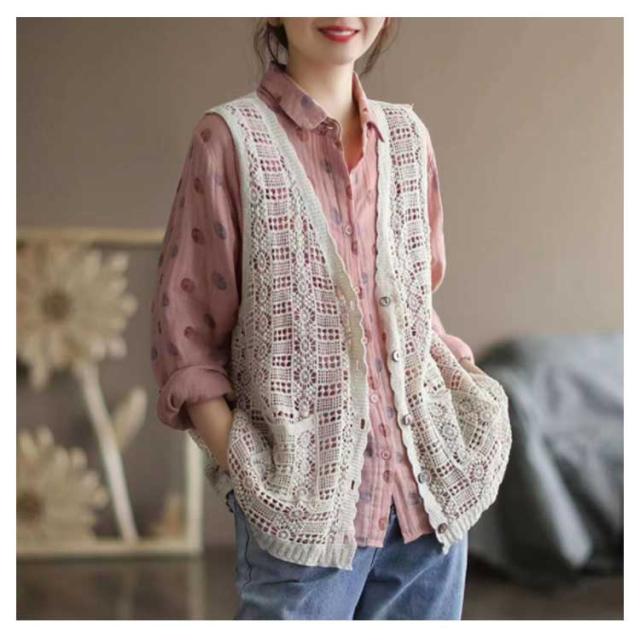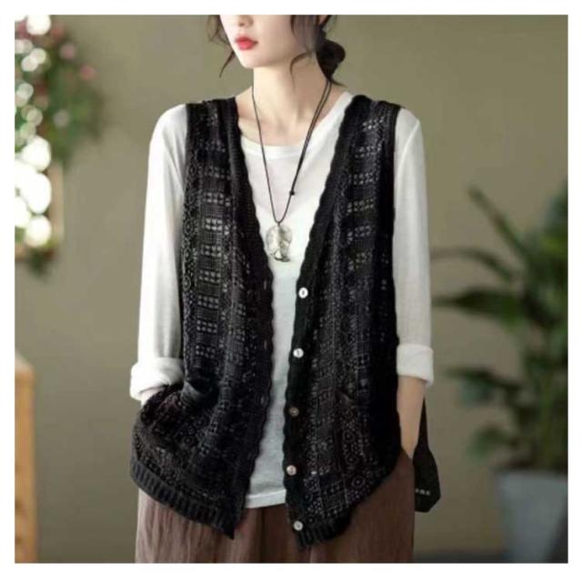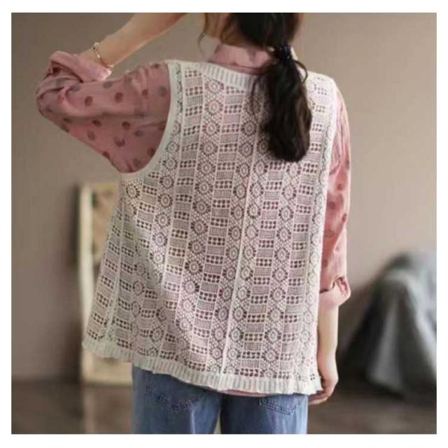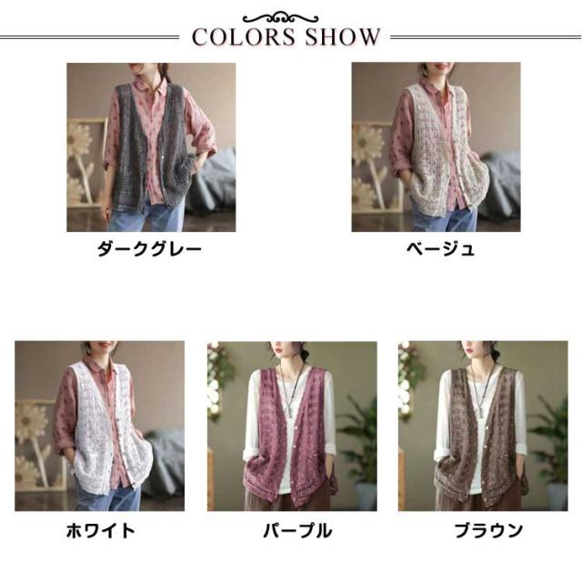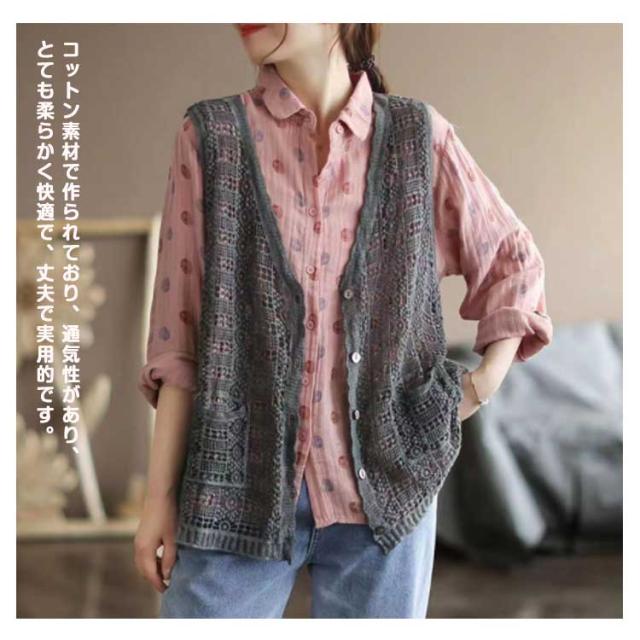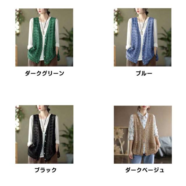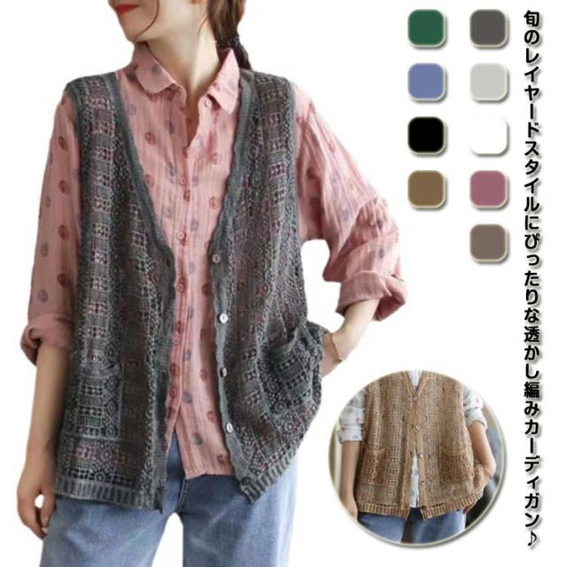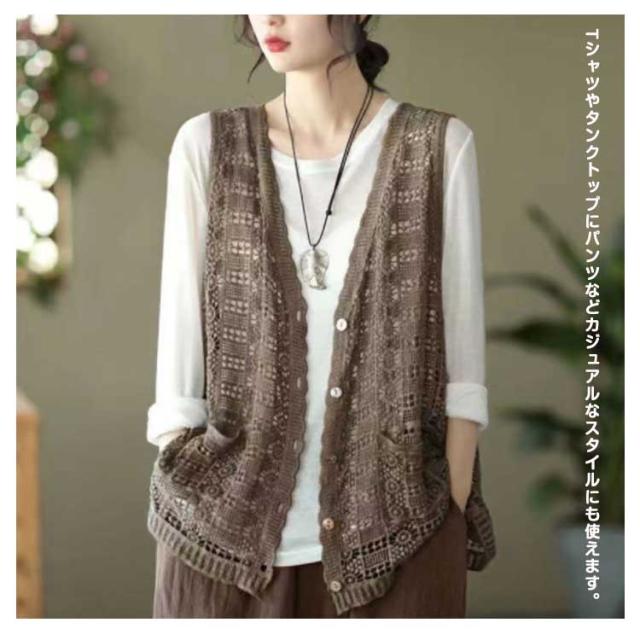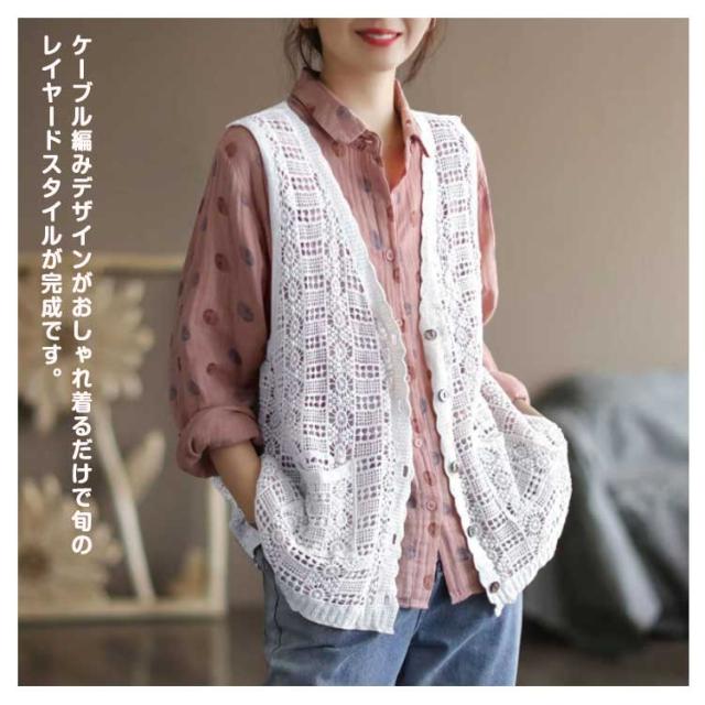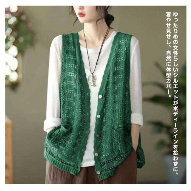 ベスト レディース 前開き ニット 透かし編み カーディガン 綿 ベスト 春夏 トップス レース編み 羽織り 袖なしトップス 薄手 洒落 重ね着 ゆったり 通勤 大人 大きいサイズ きれいめ カジュアル