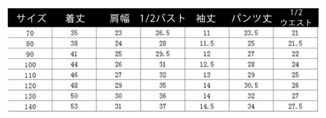 | サイズについての説明 | セット内容:シャツ、パンツ、サスペンダー、蝶ネクタイ ※上記サイズは平置き実寸になります。 サイズ表の実寸法は商品によって1-3cm程度の誤差がある場合がございます。(単位:cm) |