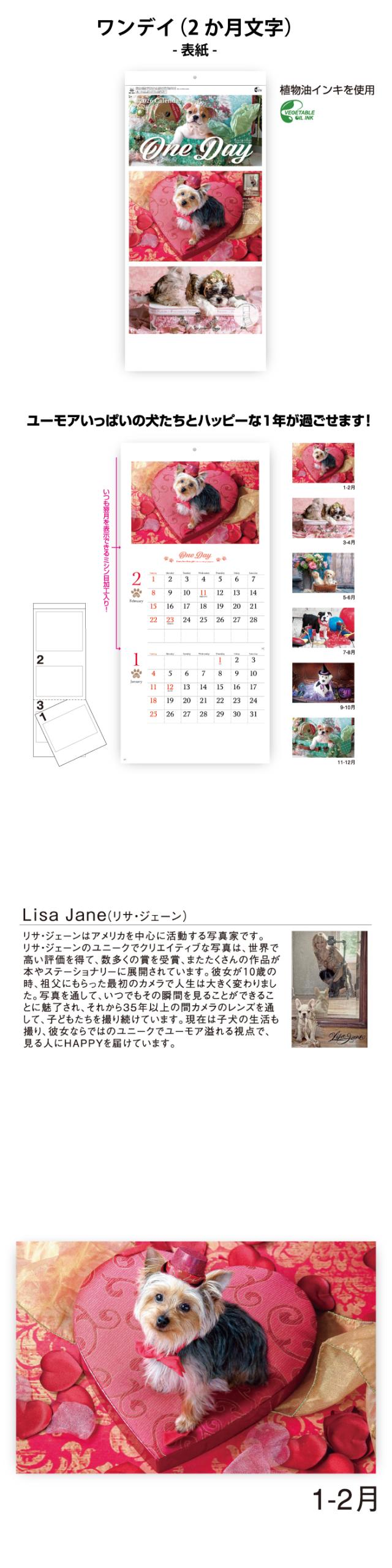 カレンダー 2026年 壁掛けワンデイ(2か月文字) NK904 カレンダー 2026年版 かわいい 犬 dog 動物 ユーモア 2か月カレンダー ミシン目 六曜 メモスペース A/3切 257929