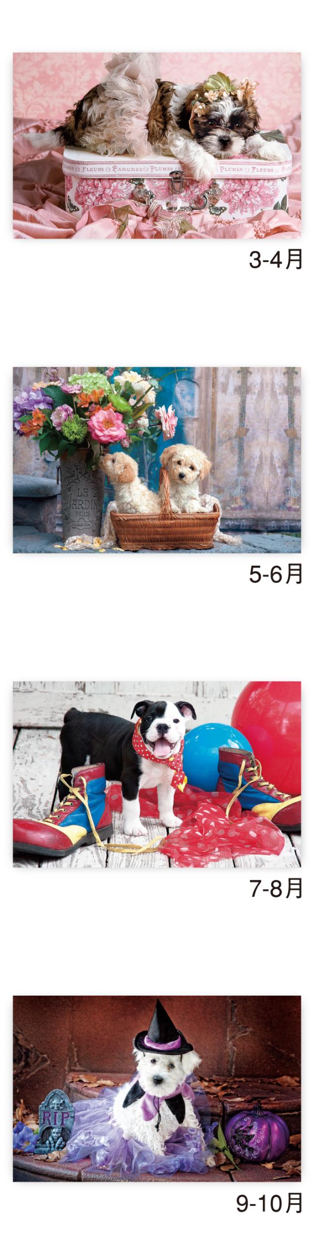 | 商品特徴 | ・ユーモアいっぱいの犬たちとハッピーな1年が過ごせます。 ・すっきりとした見やすい数字の便利な2か月表示カレンダー ・いつも翌月を表示できるミシン目加工入り |